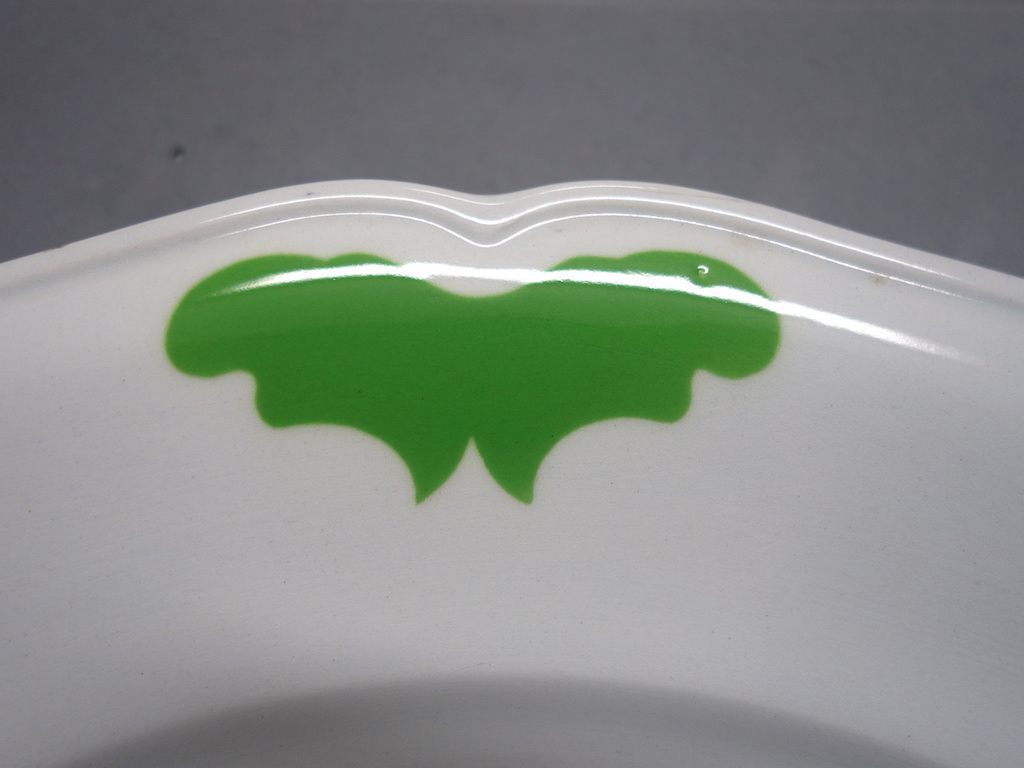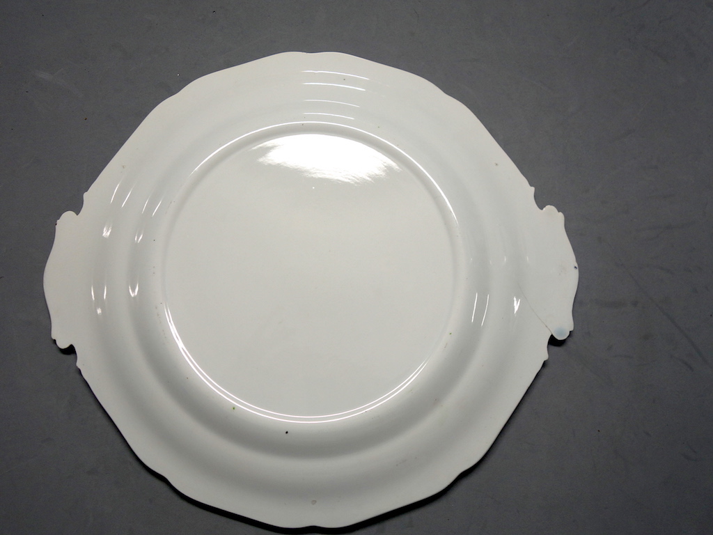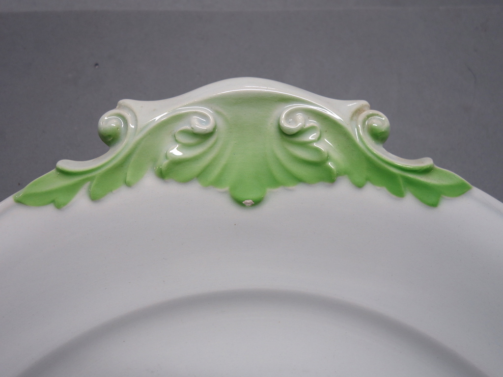 Vassoio tondo con presine in ceramica modellata e decorata. Orlo sagomato con bordo in rilievo. Ala liscia con 4 riserve a mascherina color verde. Presine ai lati decorate a rilievo ad alette a rocaille floreale, sfumate in colore verde. Fondo bianco