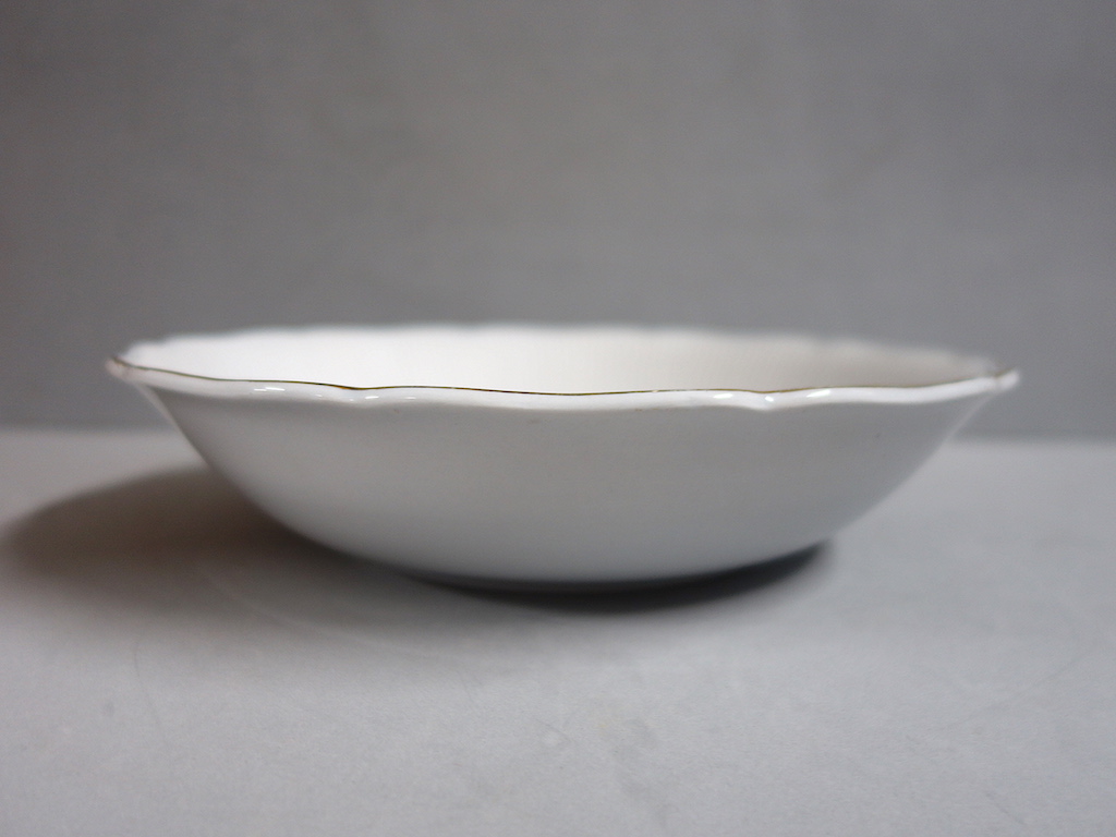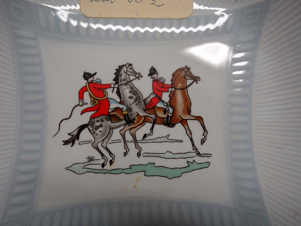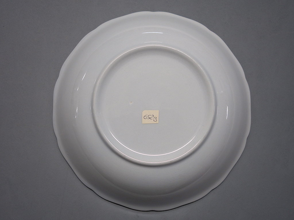 Insalatiera a forma di calotta alta espansa in ceramica modellata e decorata. Orlo lobato filettato in oro. Ala decorata a rilievo a millerighe. Fondo con al centro del cavetto decorazione a rilievo di un quadrato limitato in una fascia azzurra con all' interno decalcomania di due cavalieri. Etichetta con scritta Calotta Rombo/ cm 23 1/2