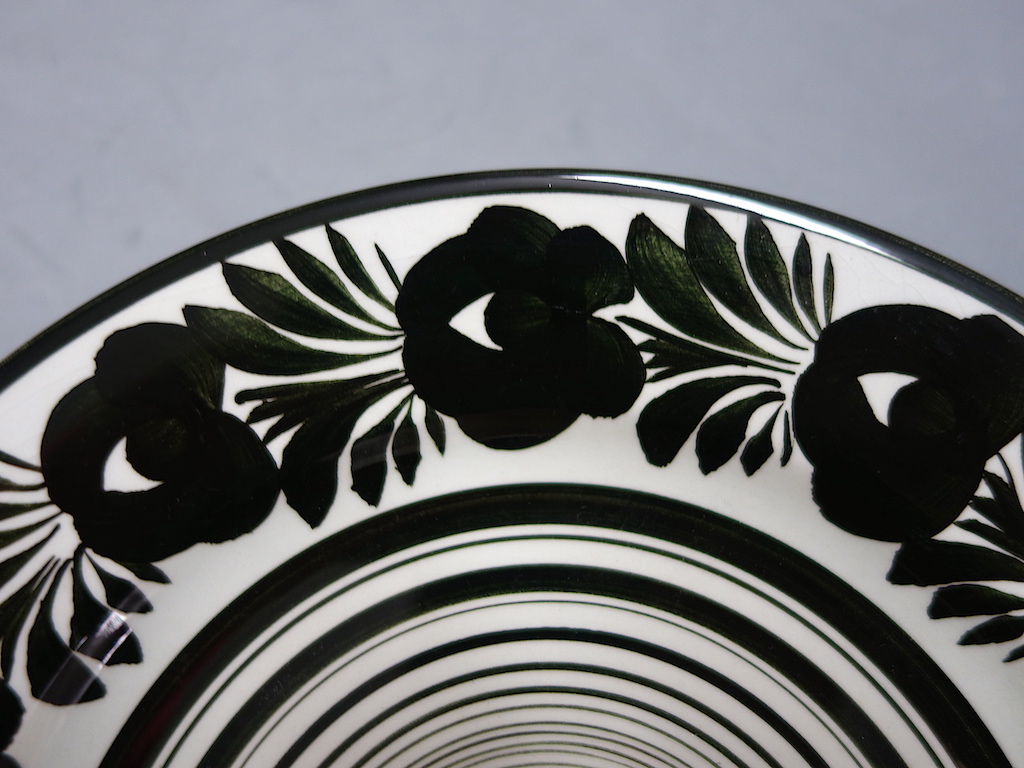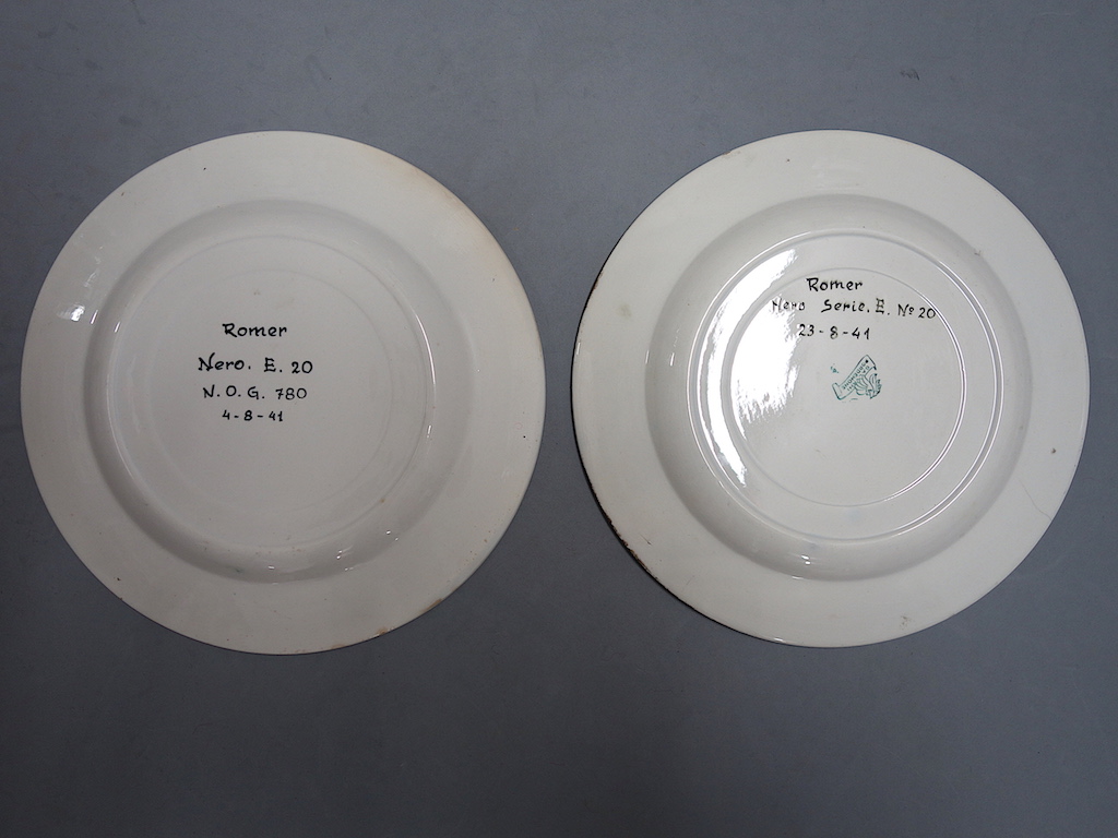 Coppia di piatti piani in ceramica modellata e decorata. Orlo liscio. Ala sfumata dal nero, verde al bianco con decorazione floreale stilizzata a seguire dipinta di colore nero. Il cavetto presenta nel piatto A una serie di cerchi concentrici di colore nero e al centro il numero 4 eseguito a stampino nero. Alla base la scritta a mano "Romer/ Nero. E 20/ N.O.G. 780/ 4 - 8 - 41. Il piatto B ha l'orlo filettato nero, il cavetto con una serie più numerosa di cerchi concentrici di colore nero e al centro il numero 2 eseguito a stampino nero. Alla base la scritta a mano "Romer/ Nero. E. N°20/ 23 - 8 - 41