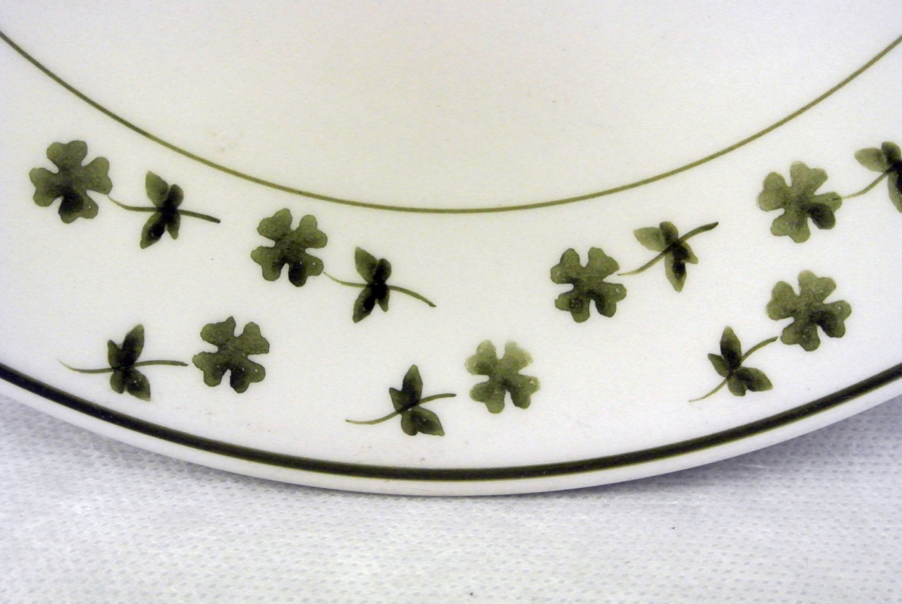 Piatto piano in ceramica modellata e dipinta. Fondo bianco, ala filettata alle estremità e decorata con quadrifogli sparsi eseguiti a tamponcino in colore verde