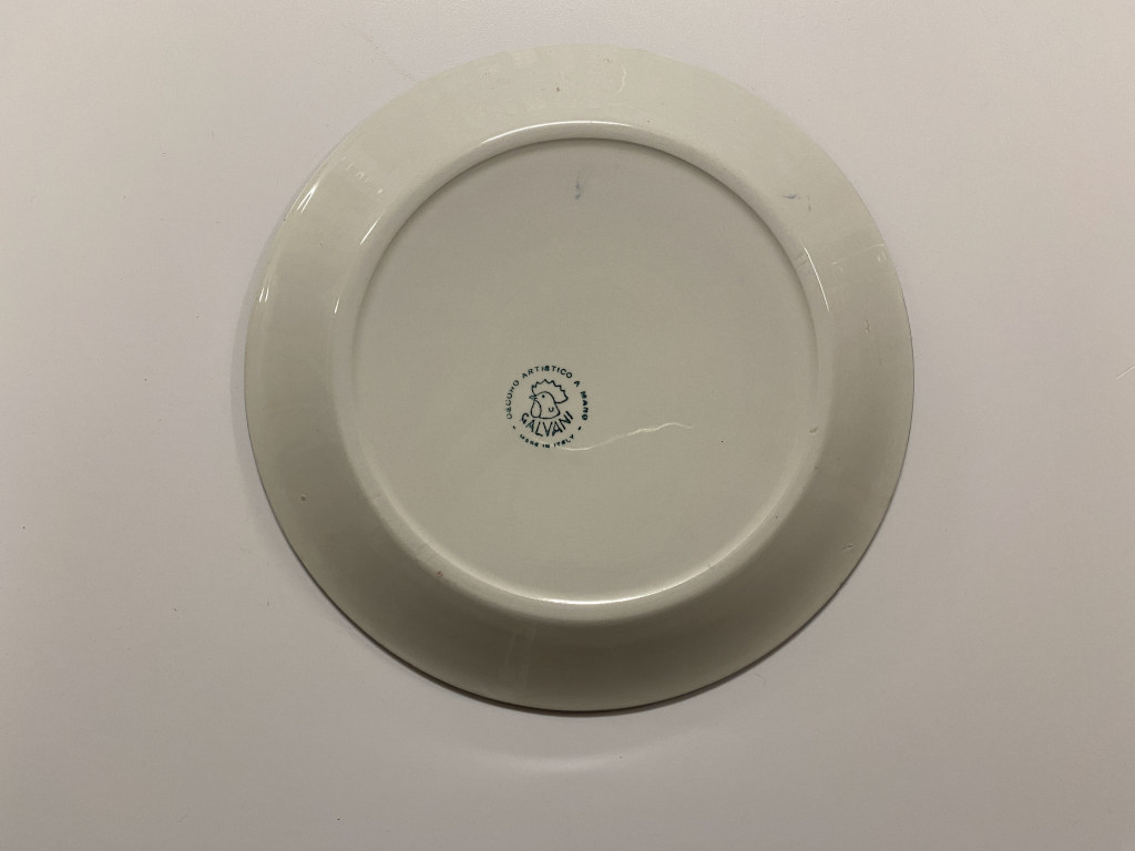 Piatto con bordo filettato e decoro vegetale a corona tra cavetto e ala: tralci di vite; in blu su fondo bianco. Sul retro marchio di fabbrica timbrato