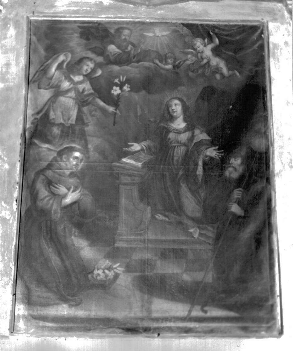 Personaggi: Dio Padre; San Francesco da Paola; Sant' Antonio da Padova; Madonna; angelo annunciante. Figure: angeli. Attributi: (Sant' Antonio da Padova) giglio; (San Francesco da Paola) bastone. Fiori: giglio. Animali: colomba