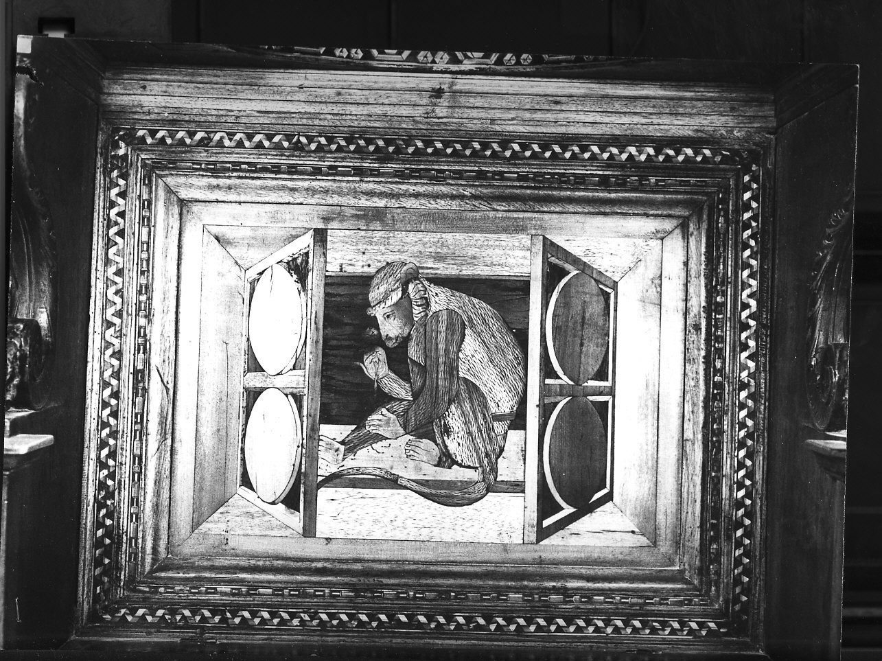 - NOTIZIE STORICO CRITICHE La minore importanza delle tarsie del secondo ordine di stalli, fa ritenere che la loro esecuzipone fosse affidata per lo più ad aiuti, su cartoni del "maestro" del coro, i cui soggetti venivano eseguiti più volte, come in questo caso