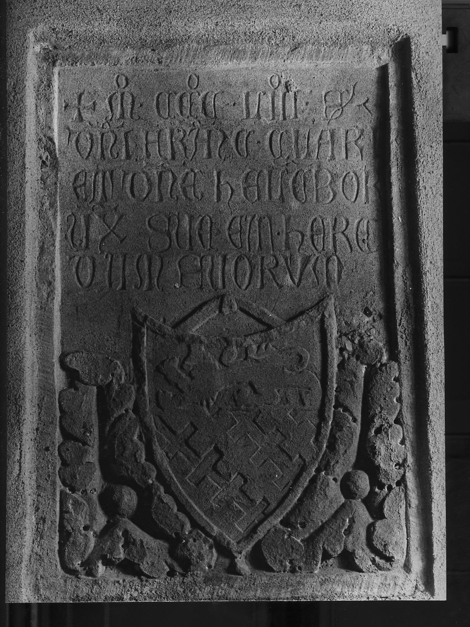 Nella parte superiore, testo in caratteri gotici; in quella inferiore insegna araldica della famiglia con ai lati due rami di lauro. Ai bordi cornice piatta