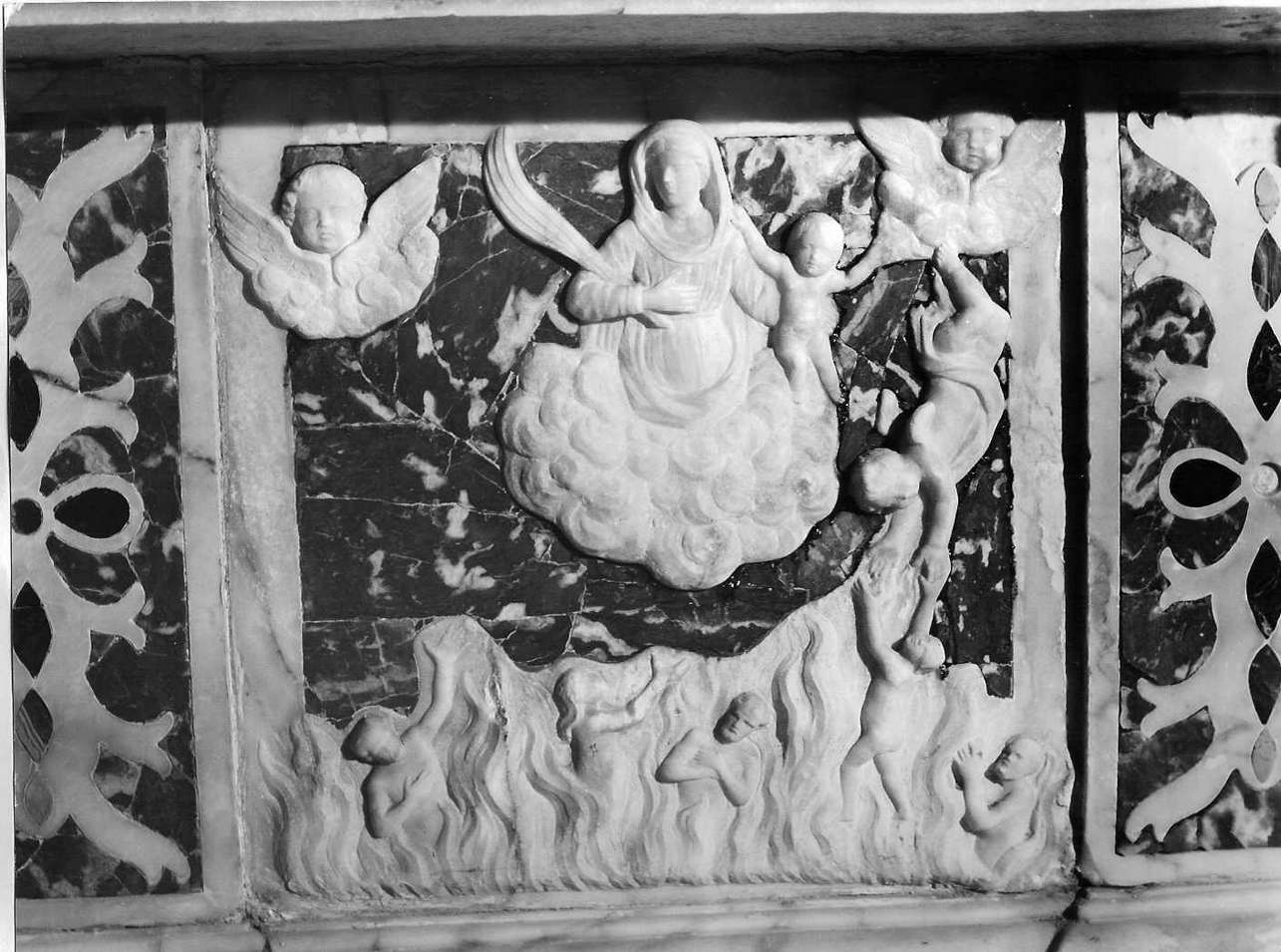 - NOTIZIE STORICO CRITICHE Nonostante l'originalità dell'esecuzione tecnica, peraltro non molto accurata, il rilevo è su un livello molto modesto, di interesse quasi esclusivamente devozionale. L'autore ha cercato di tradurre in scultura una delle consuete immagini dipinte della Madonna e delle anime purganti, semplificando al massimo il rilievo