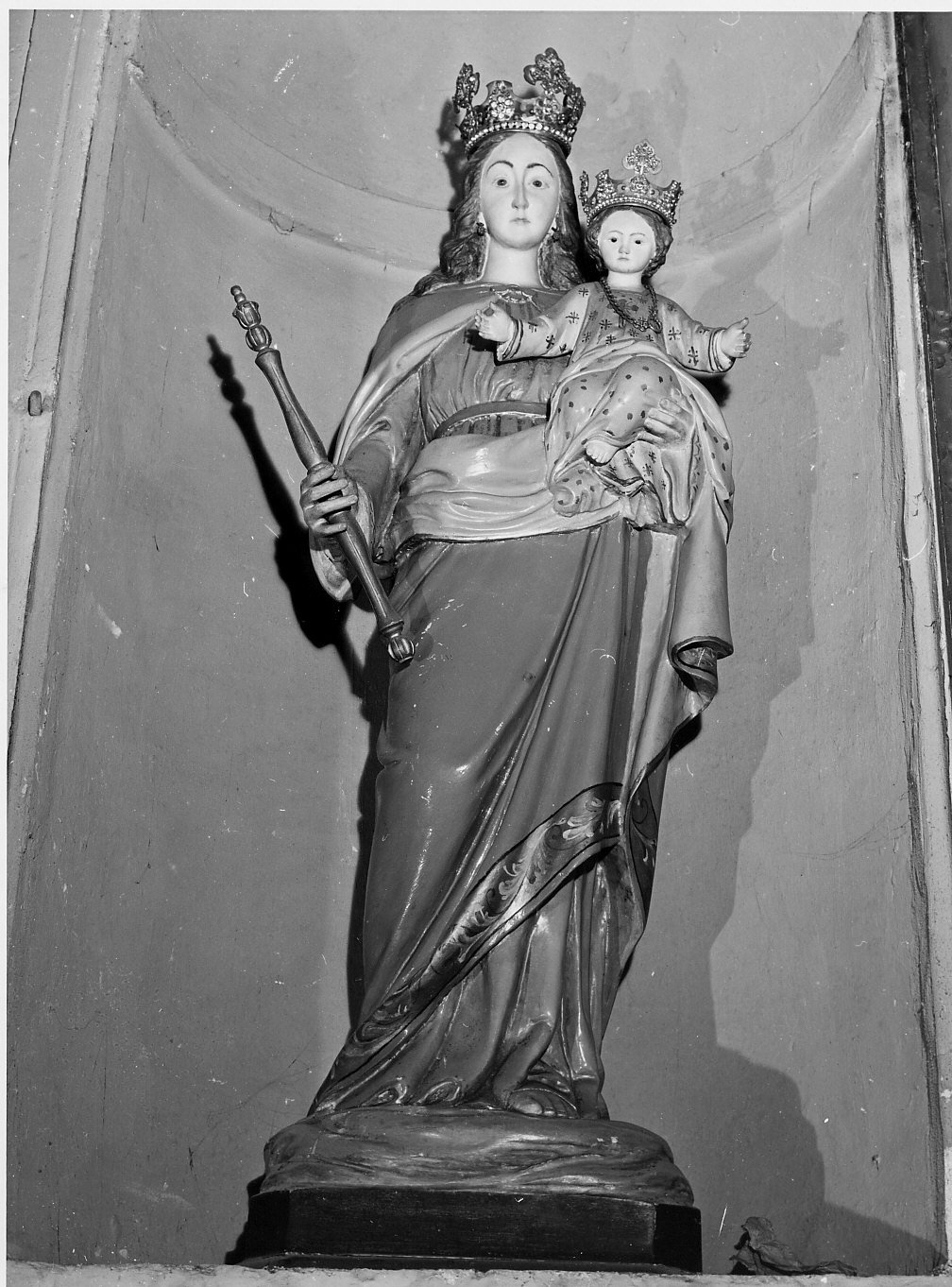 In piedi su un basamento verde, la madonna ( tunica rosa, mantello azzurro e verde con bordo dorato e dipinto) sostiene con la destra uno scettro dorato e con la sinistra il Bambino ( tunica verde e drappo rosa con stellina dorate) con le braccia protese in avanti; entrambi portano in capo corone di metallo dorato