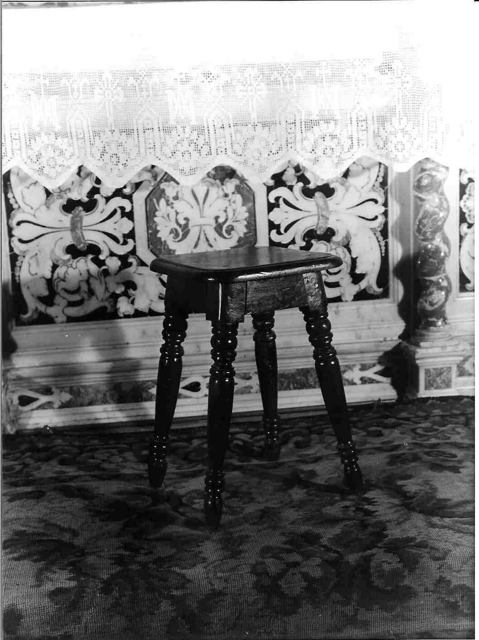 - NOTIZIE STORICO CRITICHE Si tratta di un oggetto di modesta qualità, probabilmente di produzione locale, la cui struttura e decorazione riprende motivi già tipici di mobili italiani del seicento (ad esempio le gambe tornite a rocchetto); lo sgabello è assegnabile al XIX secolo, si nota infatti in esso l'uso dei chiodi non ribattuti, di produzione industriale