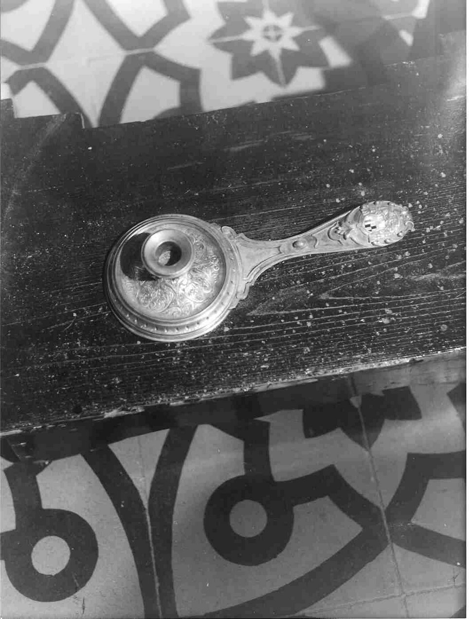Il manico della bugia presenta lo stemma, a smalti colorati, del vescovo Giuseppe Salvatore Scotti; il piatto reggicandela, di forma circolare, è decorato da motivi vegetali stilizzati