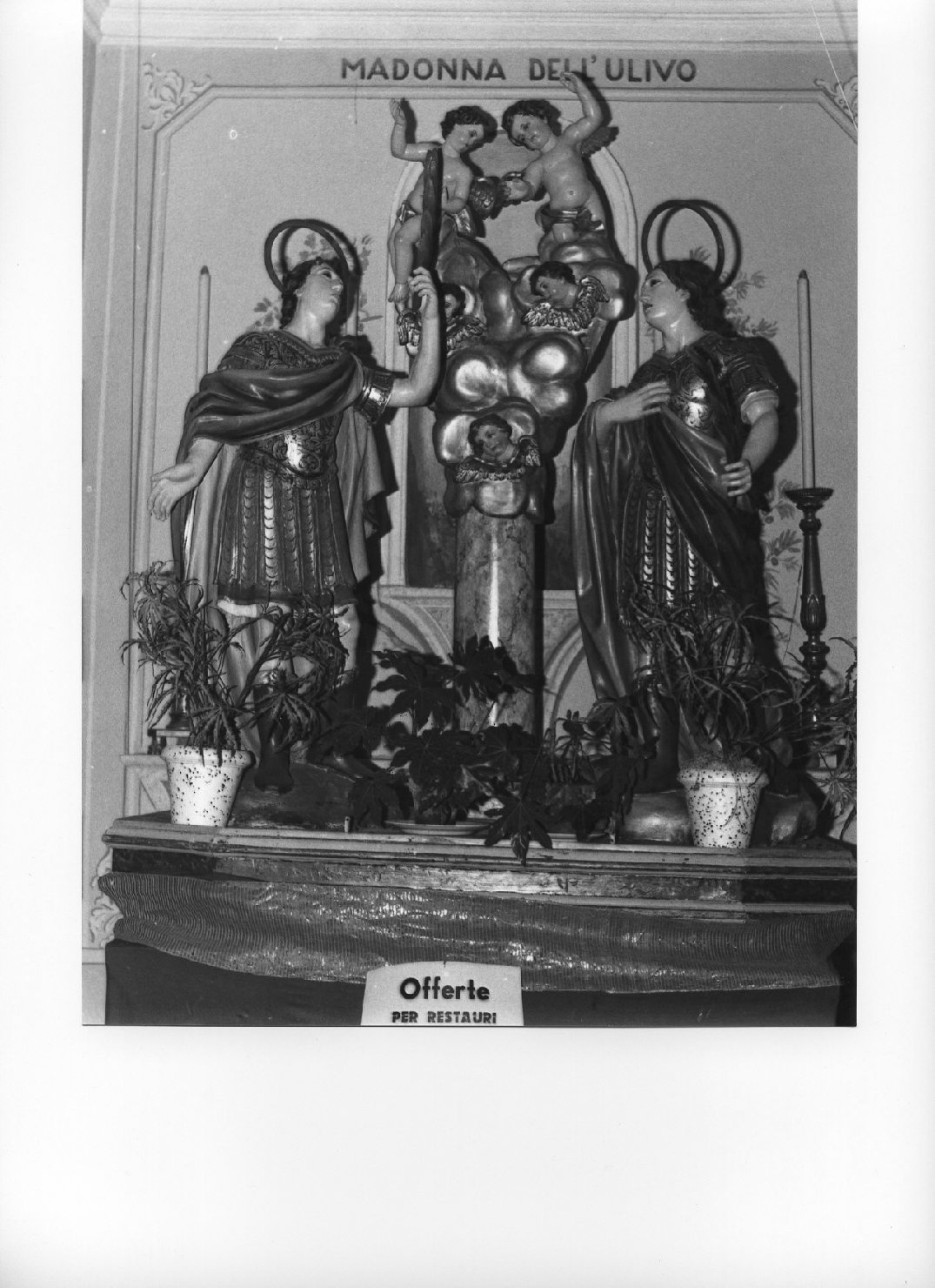 - NOTIZIE STORICO CRITICHE Il gruppo scultoreo raffigurante i SS. Cosma e Damiano viene menzionato per la prima volta da padre Enrico del SS. Sacramento (1979, p. 11). Padre Enrico lamenta il fatto che le statue, eseguite intorno alla metà del sec. XIX e di non buona fattura, hanno sostituito il pregevole dipinto raffigurante la Madonna e i SS. Cosma e Damiano, di cui non si sono trovate più tracce. Il gruppo, eseguito probabilmente da uno scultore locale, risente del gusto popolare della sacra rappresentazione