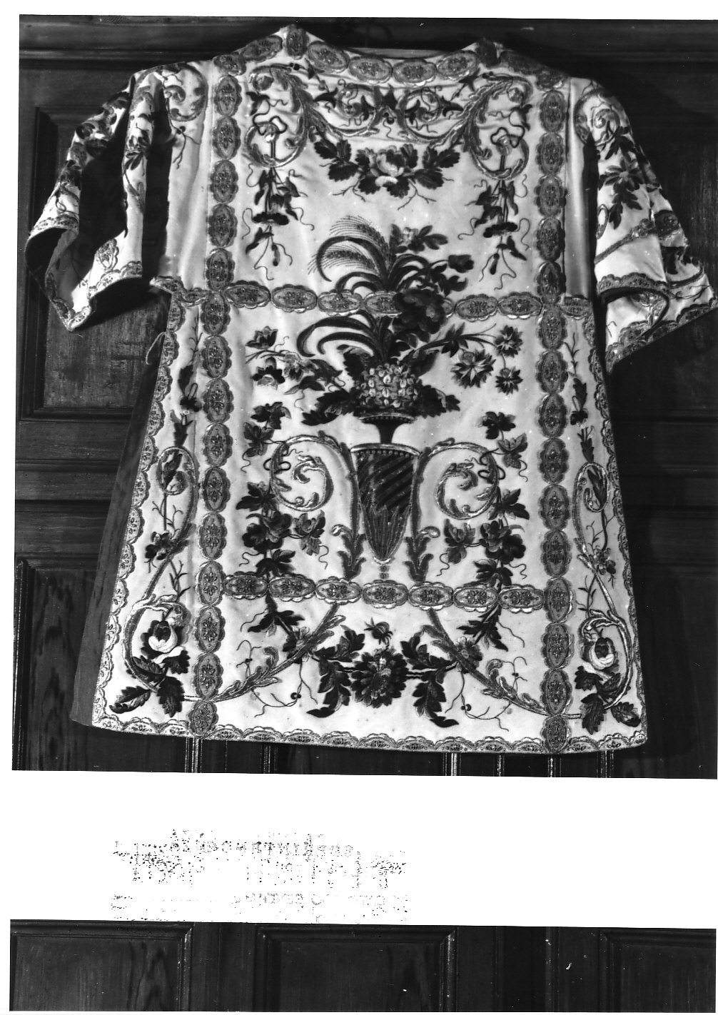 Il fondo in seta bianca di sostituzione recente è in gran parte ricoperto dal ricco ricamo in oro e fili colorati nei toni del rosso, rosa, azzurro, blu, a punto pieno imbottito e a punto lanciato.Sulla pianeta e sulle tonacelle campeggia un vaso piriforme con un grande mazzo di fiori, tra cui notevoli le peonie, e con spighe di grano.Da esso si dipartono elaborate girali fitomorfe arricchite da tralci floreali, motivi che ricorrono speculari all'asse centrale, su tutto lo spazio disponibile.Sui due piviali minori, il vaso è di forma arrotondata, la decorazione floreale più elaborata e fitta.Sul piviale maggiore, in luogo della composizione floreale, è raffigurato l'Agnus Dei su larga coppa decorata. In luogo del gallone, il parato presenta un'applicazione a smerli di ovoli e teletta d'oro con lustrini disposti a corolla