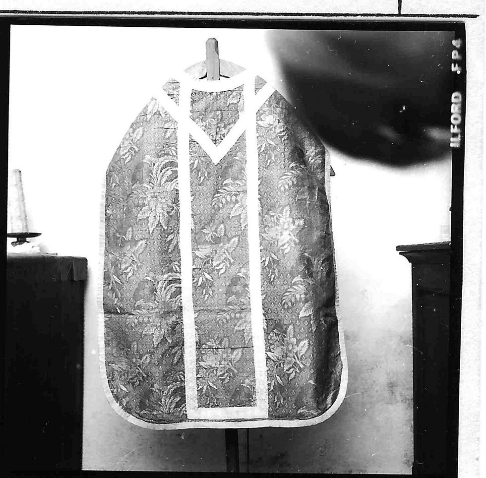 - NOTIZIE STORICO CRITICHE Per il tipo di fondo del disegno a fiorellini a tre petali, i mazzi delle peonie dalle foglie frangiate e i fiori descritti realisticamente, il lampasso è assegnabile al XVIII sec. In ambito ligure la pianeta è confrontabile, seppure il tessuto sia meno pregiato, con un'altra il cui disegno presenta alcuni motivi analoghi, conservata a Bonassola, Chiesa parrocchiale di S. Caterina, riprodotta in indice, 18-19, 1979, p. 20 fig. 2. Il parato viene menzionato per la prima volta nell'inventario del 4 dicembre 1841