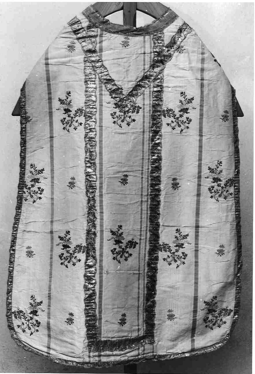 - NOTIZIE STORICO CRITICHE Per la decorazione a fasce verticali segnate da righe intercalate da mazzi di fiori minuti e per i colori tenui e delicati, è possibile riferire il tessuto alla produzione ligure di epoca neoclassica della fine del XVIII secolo (cfr. Morazzoni, 1941)