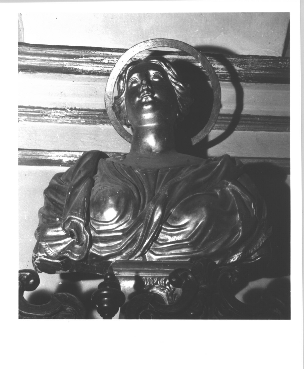 Il basamento sagomato funge da teca per la reliquia e presenta una finestrella ovale profilata da una ghirlanda di foglie. Al di sopra poggia il busto raffigurante una giovane donna con i capelli raccolti alla nuca, l'aureola e un abito panneggiato dalla foggia a tunica