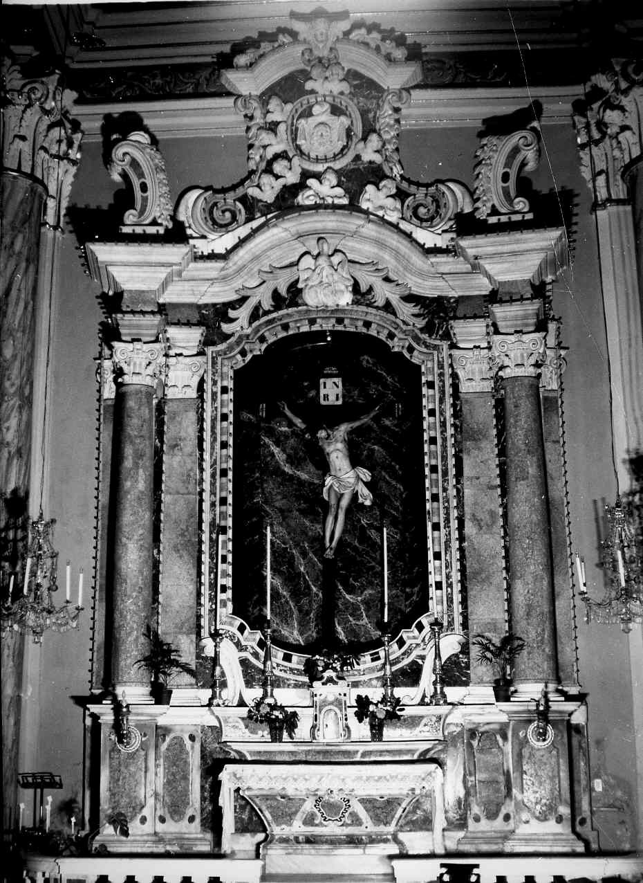 Altare in marmi misti, fiancheggiato da due colonne in marmo rosso addossate a lesene; fronte mistilineo in marmo bianco di Carrara, coronamento con testine alate e volute che circondano il Sudario. Nel centro grande nicchia rivestita in verde Polcevera racchiudente il Crocefisso e incorniciata da tarsie di vari colori. Mensa in marmo bianco e intarsiato in vari colori