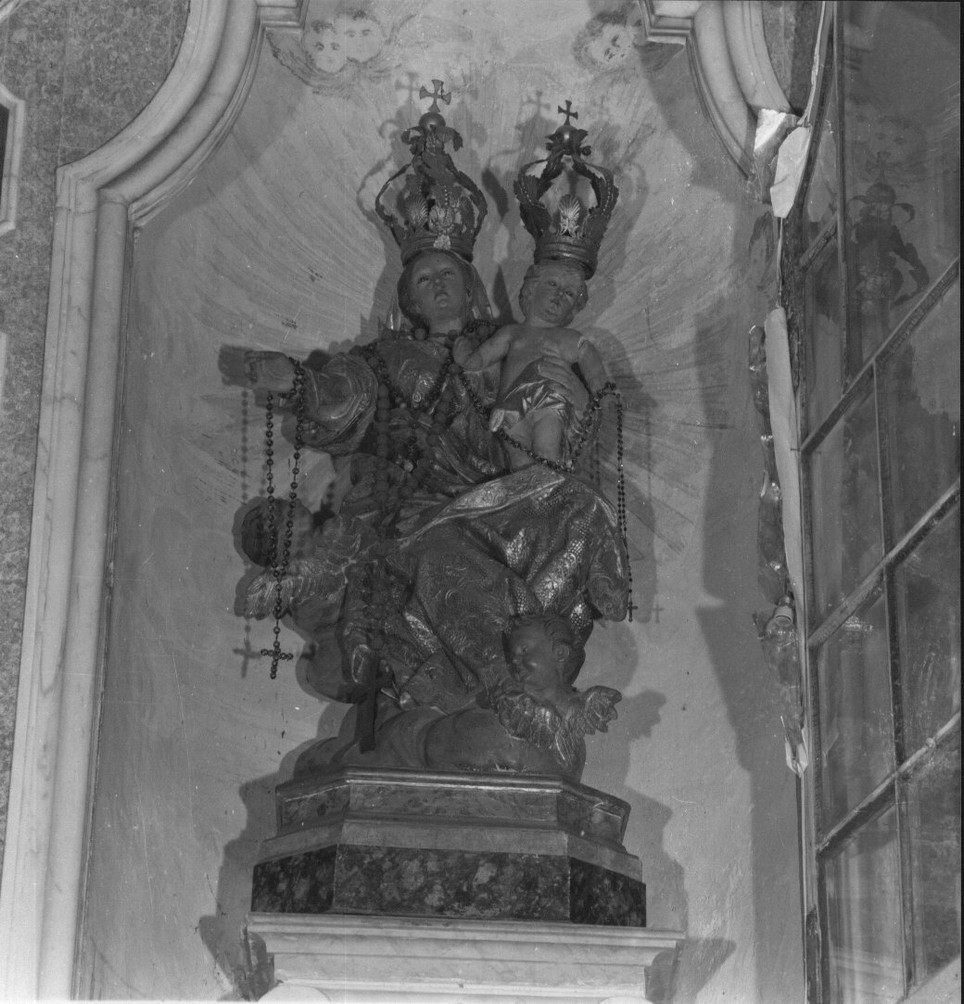 - NOTIZIE STORICO CRITICHE L'iconografia del Rosario e la presenza della decorazione degli abiti, fanno proporre come datazione generica il XVIII secolo. La costruzione della figura della Vergine, possente e dall'ampio panneggio fa pensare che la datazione vada intorno alla prima metà del settecento. Questa datazione è attestata dal Remondini a pagina 87 dove troviamo scritto: "...sin dal 1738...balenò l'idea di vedere ultimata una cappella... e fu quella del Rosario... ponendovi la già venerata statua di Maria"