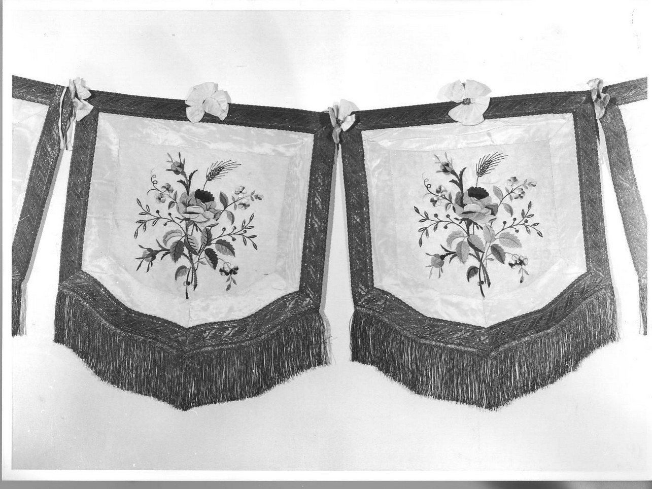 L'apparato è composto da venti bandinelle. Ogni bandinella è in damasco bianco ricamato con rose, fiorellini azzurri, viola e aranciati e spighe di grano e ramoscelli d'ulivo in filo dorato. Ogni riquadro è stato forse ampliato aggiungendo lungo il bordo una striscia di nastro bianco, ed è incorniciato inoltre da un gallone dorato, decorato con foglie altarenate a fiori fortemente stilizzati. Al bordo inferiore è applicata una frangia in filo d'oro