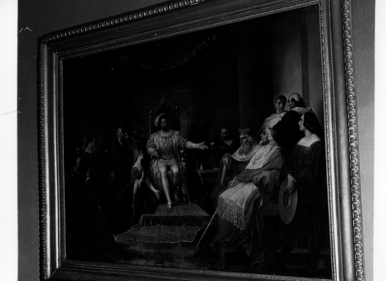 - NOTIZIE STORICO CRITICHE La grande tela passò alle raccolte comunali in seguito all'acquisto del palazzo Patrone (1898). Successivamente inventariata presso la Galleria d'rte Moderna di Genova-Nervi (n. 143), veniva ceduta in deposito alla Prefettura nel 1948. Infelice l'attuale ubicazione (salotto dell'alloggio prefettizio), che impedisce una buona visione frontale del dipinto. Non sono note le originarie ragioni di committenza relative al soggetto e manca una qualsiasi attribuzione ad autore o scuola del sec. XIX. Non buono l'attuale stato di conservazione (che un inventario dattiloscritto del 1965, relativo ai beni di terzi conservati in Prefettura, definiva "buono"). L'episodio storico qui raffigurato è ambientato nella reggia londinese e relativo alla richiesta ufficiale di divorzio rivolta dal re ai legati pontifici: l'atteggiamento supplice di Caterina d'Aragona dovrebbe essere verosimilmente legato alla volontà del re, di addurre le motivazioni scritte in vista di una eventuale dispensa papale.Il dipinto dovrebbe essere ambientato tra il settimo e l'ottavo decennio del secolo XIX, in area presumibilmente genovese e in un filone di pittura di storia contemporaneo e parallelo a Nicolò Barabino: si pensi alle figure di Isola o, meglio ancora, di Giannetti