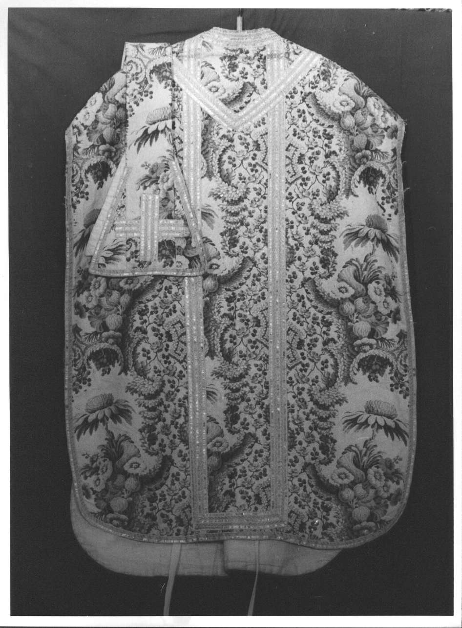 - NOTIZIE STORICO CRITICHE Per i caratteri stilistici, il paramento dai motivi materialistici alla Jean Revel, è attribuibile al secolo XVIII, intorno al 1740. (cfr. D. Devoti, L'arte del tessuto in Europa)