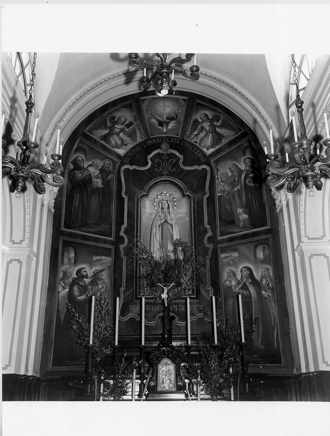 La cornice dell'altare forma setta scompartimenti, nei maggiori sono dipinti santi e sante cappuccini