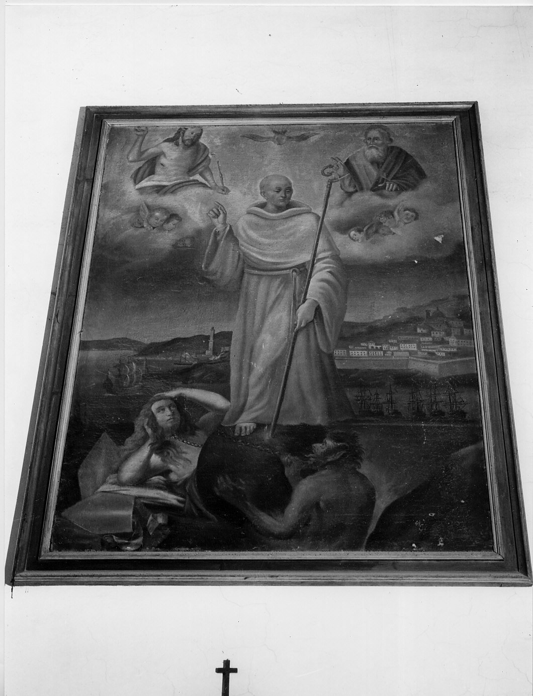 Personaggi: San Bernardo; diavolo; donna. Attributi: ( San Bernardo) mitra episcopale e cardinalizia; globo. Abbigliamento religioso: abito dei cistercensi. Paesaggi: Genova