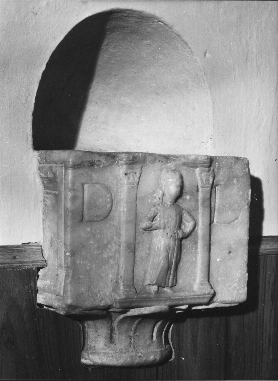 - NOTIZIE STORICO CRITICHE L ' acquasantiera è molto probabilmente ottenuta scavando un capitello cubico; essa è infatti sostenuta da un giro di foglie che si potrebbero adattare ad una colonnina. Probabilmente non appartiene alla chiesa di S.Dalmazio come sembrerebbe provare la figuretta in bassorilievo non rispondente all'iconografia di S.Dalmazio, con il quale è sempre stata identificata, ma piuttosto a quella di S.Lorenzo come potrebbero confermare le due lettere incise D e L (Divo Laurenti).Estremamente semplice, privo di particolari apporti decorativi il lavoro è caratterizzato da un tipo di bassorilievo ancora arcaico ed ingenuo anche se la lieve flessione della gamba del santo e la sua impostazione contribuiscono ad una datazione non anteriore al sec.XVl
