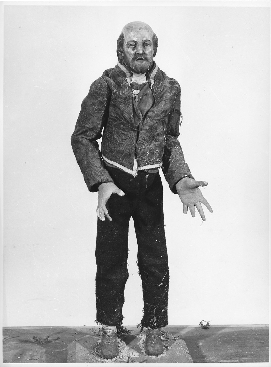 Il popolano costituito da un manichino in legno snodato scolpito in parte preparato e colorato indossa brache nere, camicia bianca, scamiciato in velluto verde, giacca in gros broccato e rosso