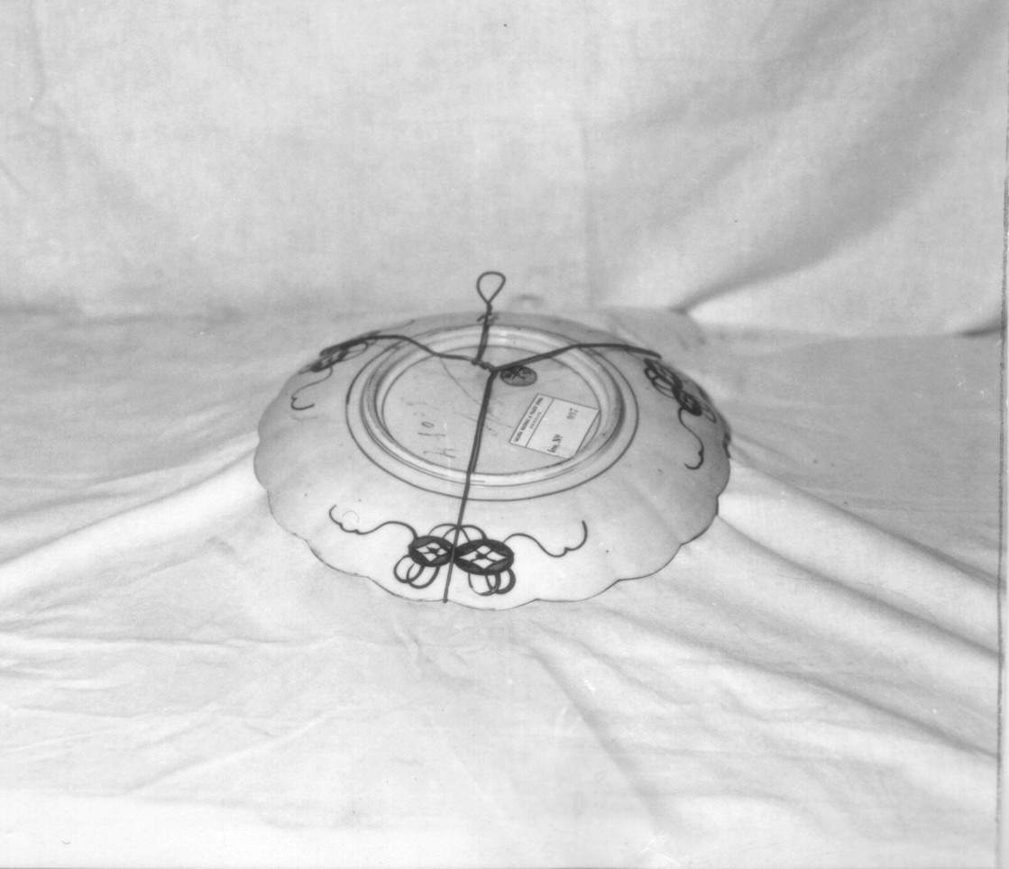 Piatto ad orlo e su superficie lobata, policromo. Entro la riserva centrale lobata, vaso ornamentale contenente peonie e fiori di pesco. Sulla tesa tre riserve identiche a ventaglio sono separate da coppie di spicchi decorativi: uno blu con sottili losanghe fra nastri in oro, l'altro con motivi geometrici tratti dai tessuti. Nelle riserve rami di pruno fioriti fra nuvole e rocce. Sul retro coppie di losanghe augurali in blu sottocoperta