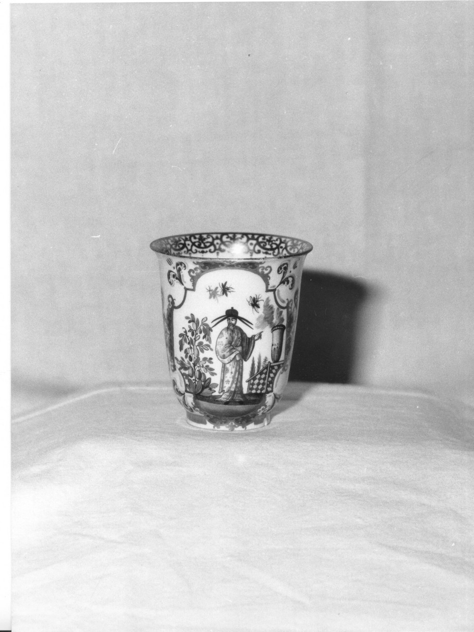 Tazzina senza anse, in porcellana sottile. Entro due riserve mistilinee, diametralmente opposte, sono raffigurate scene cinesi di fantasia che vedono uniti personaggi farfalle ed alberi fioriti. Il decoro è eseguito in oro rosso e verde
