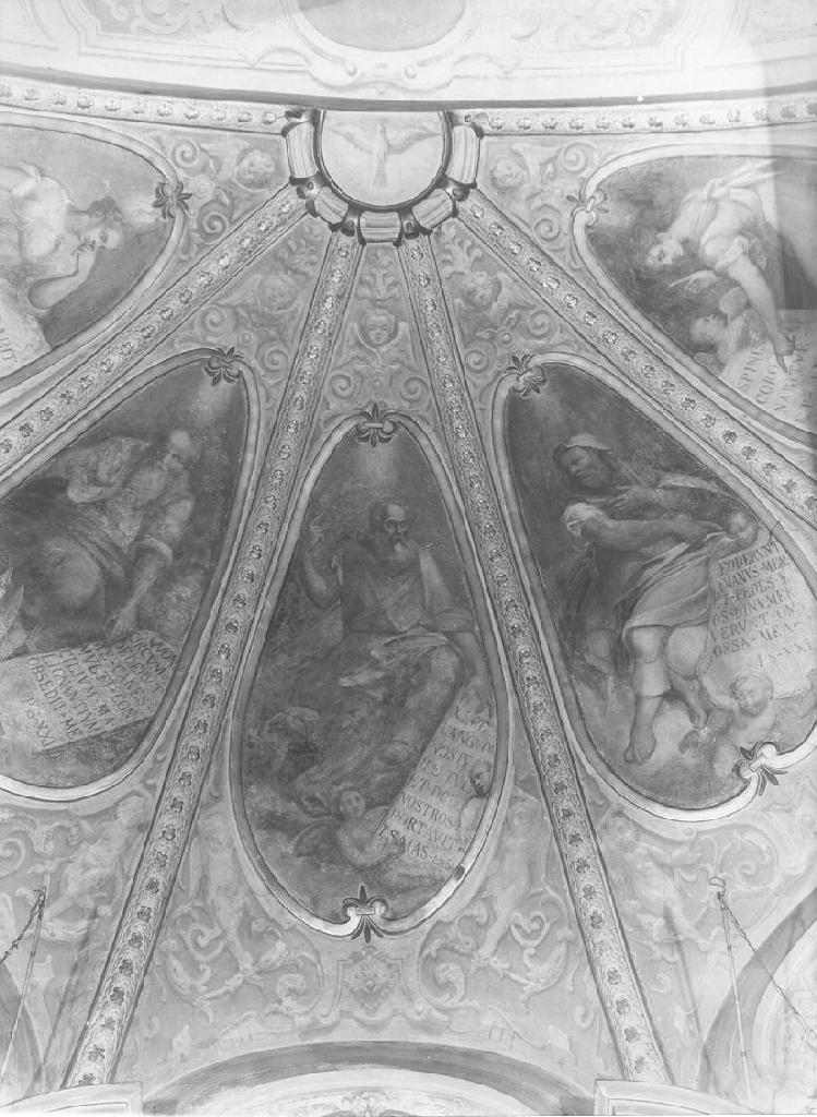 LA VOLTA E' SCOMPARTITA IN CINQUE SPICCHI ENTRO CUI SONO AFFRESCATI, IN CORNICI DORATE, DUE SIBILLE E TRE PROFETI. ALLA SOMMITA' DELLA VOLTA, NEL PUNTO DI CONVERGENZA DEGLI SPICCHI, IN UN TONDO, E' RAFFIGURATA LA COLOMBA DELLO SPIRITO SANTO