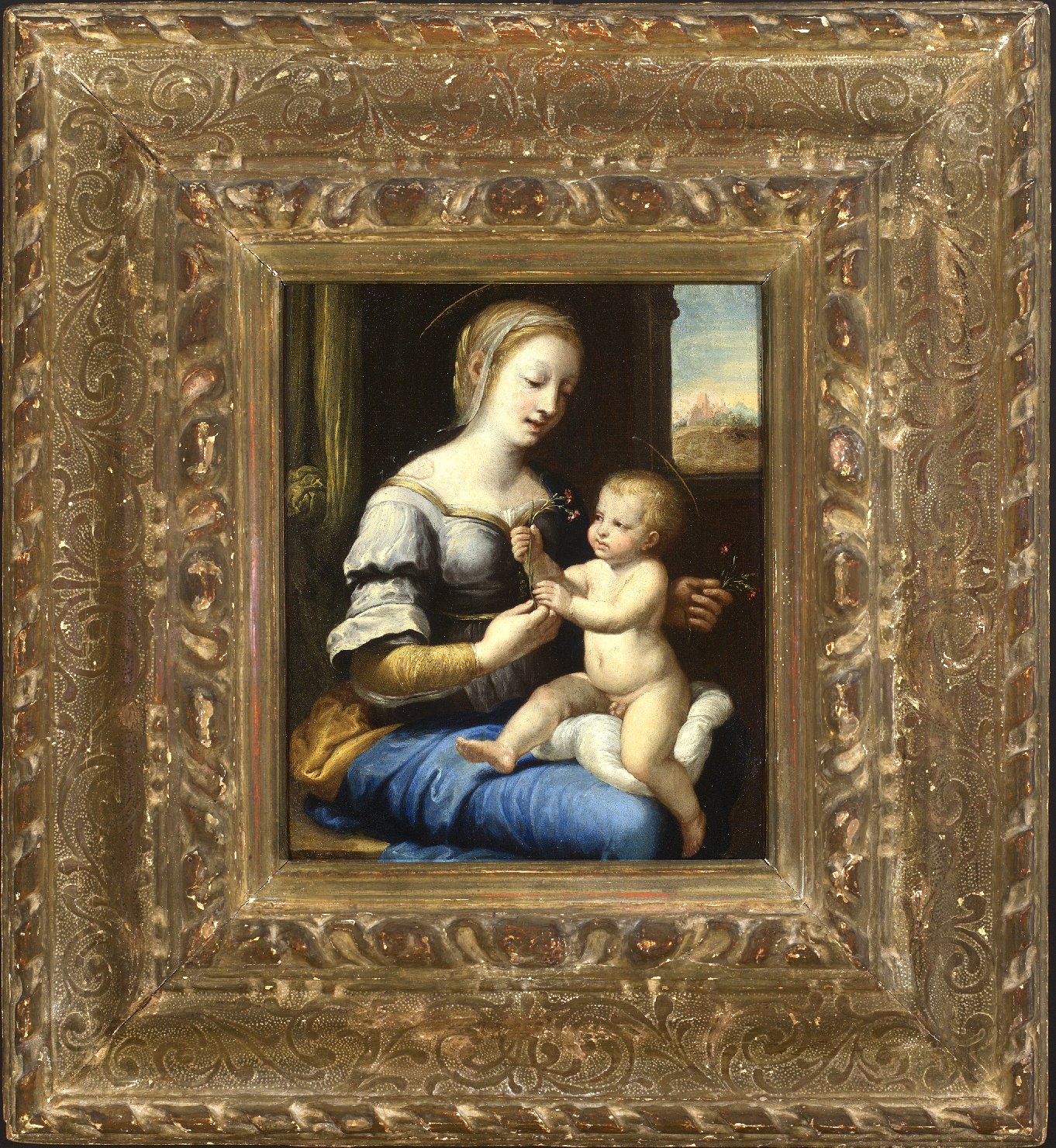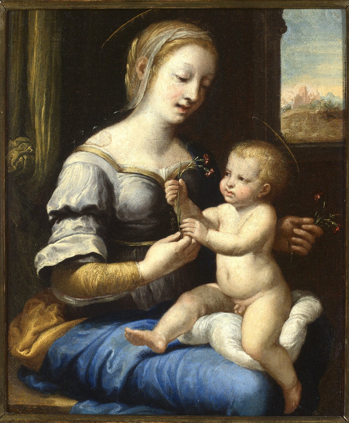 - NOTIZIE STORICO CRITICHE Il dipinto è una copia della Madonna dei Garofani di Raffaello (Londra, National Gallery, inv. NG6596). Sul retro è una iscrizione antica che attribuisce l’opera al ferrarese Benvenuto Tisi detto Garofalo, paternità non sostenibile. Al momento dell’acquisizione da parte della Stato italiano, nel 1963, l’opera era attribuita alla cerchia romana del Sanzio, con una datazione entro i primi decenni del XVI secolo. Marco Casamurata, riprendendo la suggestione sul Garofalo, ha recentemente proposto l'ambito emiliano come retroterra di esecuzione dell'opera - vista anche la “vaga intonazione correggesca” - collocandola entro la fine del Cinquecento (Casamurata 2022, p. 83)
