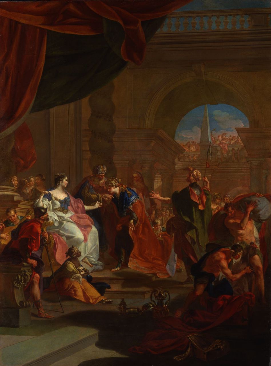 - NOTIZIE STORICO CRITICHE Il dipinto è stato concordemente assegnato dalla storiografia critica a Carlo Bonone, con l'unica eccezione del Suida, che, assimilandolo alle altre tre sovrapporte, lo ritiene opera del Solimena. Tali attribuzioni non sono però accolte dal Torriti che propone invece un'assegnazione al Beaumont, sulla scorta delle strette somiglianze stilistiche con le tre sovrapporta della camera del Principe del Palazzo Reale di Torino, coeve all'opera in esame, eseguita poco dopo il 1737, probabilmente per lo stesso palazzo Reale di Torino e solo in seguito, con i Savoia, trasportato a Genova. Il soggetto fu riconosciuto in Nino e Semiramide fin dall'inventario del 1836, tuttavia non sembra di poter rintracciare nella storia della leggendaria regina babilonese un episodio così descritto. Un confronto valido a confermare l'iconografia di Alessandro e Rossana è quello con il bozzetto di un arazzo delle Storie di Alessandro dello stesso Beaumont databile attorno al 1731 nel quale l'artista allestisce il banchetto dei due sposi con sostanziali analogie di gesti e pose. Si segnala infine che le alterazioni del supporto subite probabilmente intorno al 1836 hanno modificato radicalmente il formato originale, alterando in parte la scena rappresentata. Nella metà superiore risultano completamente inventati sia il pesante tendaggio del baldacchino che il coronamento della quinta architettonica con balaustra. Si ritiene che in coincidenza con gli ingrandimenti la tela abbia subito una riduzione sui lati. Anche se non è possibile precisare le misure, pare plausibile che il dipinto dovesse essere caratterizzato da un rapporto altezza e larghezza opposto a quello attuale