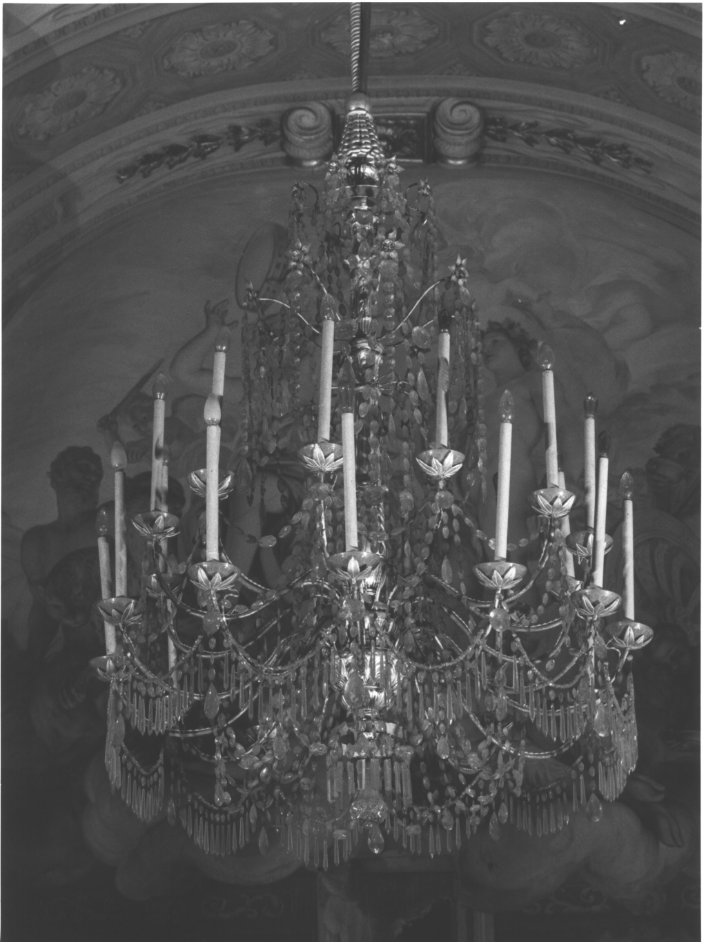 - NOTIZIE STORICO CRITICHE Lampadari databili al secolo XVIII, epoca Luigi XVI. Pur presentando una decorazione più semplificata rispetto al lampadario centrale collocato nella galleria degli Specchi, essi vanno tutti riferiti allo stesso periodo, e cioè alla fine del XVIII secolo (revisione Olcese C. 1985). I lampadari compaiono descritti nel palazzo per la prima volta nell'inventario del 1830