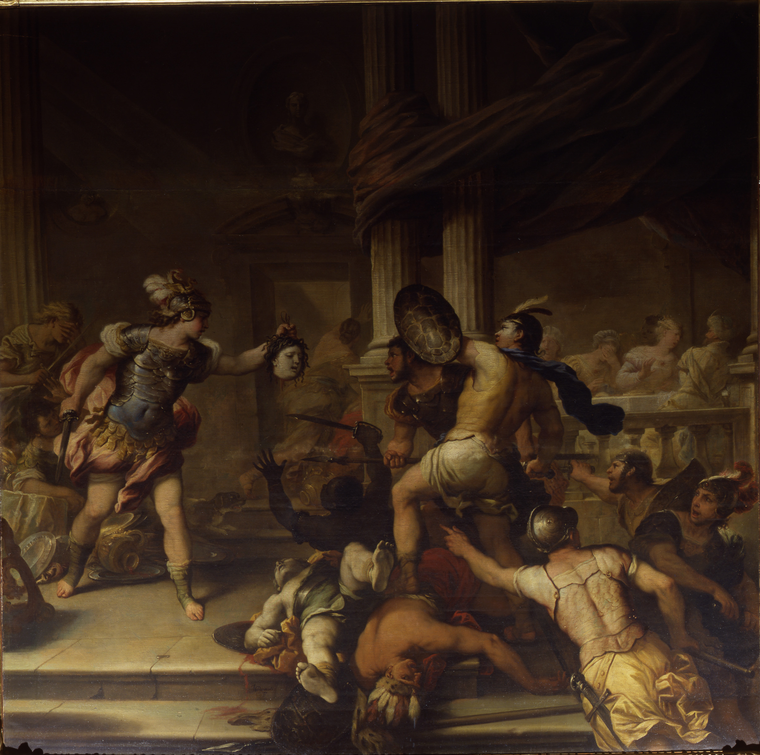 - NOTIZIE STORICO CRITICHE L'opera fu ammirata per secoli nel salotto in cui ancora oggi è esposta ma che, prima della trasformazione sabauda in Sala del Trono, era detto Sala di Luca Giordano. Si tratta di uno dei capolavori delle collezioni di Palazzo Reale, costruito secondo un impianto scenografico di efficacissima resa, ricco di artifici prospettici e linee dinamiche che ne accentuano il cadenzato ritmo compositivo. Alcuni dettagli svelano l'originalità iconografica – certamente ispirata dalle parole del racconto ovidiano – che Giordano ha saputo costruire: si veda, ad esempio, lo scudo di Fineo ricavato dalla corazza di una tartaruga. Grazie all'ultimo intervento di restauro si è potuto capire che la tela – insieme al suo pendant ovvero Clorinda salva Olindo e Sofronia – è stata ingrandita, probabilmente nella prima metà del Settecento, con l'inserzione della parte superiore delle colonne, gran parte del panneggio che oggi le ricopre, la nicchia sopra la porta con il busto all'antica e i due coni di luce che scendono da sinistra. Le misure originali dovevano essere all'incirca pari a 250 x 350 cm. Carlo Giuseppe Ratti ricorda che fu Domenico Parodi a essere incaricato da Gerolamo Ignazio Durazzo (1676-1747) di adattare entrambe le tele alle incorniciature in stucco. Anche nel secondo dopoguerra, quando l'opera rientrò a palazzo dai rifugi antiaerei, dovette registrarsi un intervento. Grazie a recenti ritrovamenti documentari si può specificare che i due quadri di Palazzo Reale – insieme alla Morte di Seneca (opera che uscì dalle collezioni del Palazzo dopo il 1836) e ad altri cinque Luca Giordano – facevano parte della quadreria di Marc'Antonio Grillo (1643-1703) alla data maggio 1707. Sette degli otto dipinti, con l'esclusione dell'Allegoria della Pace oggi conservata a Palazzo Spinola di Pellicceria, il 3 dicembre 1709 vennero messi all'asta e acquistati da Francesco Maria II Balbi. Tra il 1709 e il 1739 la proprietà passò a Gerolamo Ignazio Durazzo, in circostanze però oggi non note, verosimilmente facilitate dalla parentela che legava i due signori: Francesco Maria aveva infatti sposato Clarice, sorella del Durazzo. Dunque la prima notizia che certifica la presenza di entrambi i Luca Giordano a Palazzo Reale risale al 1 luglio 1739, alla lettera che Charles de Brosses scrive a Monsieur de Quintin, e viene poi confermata da fonti seguenti. Luca Giordano realizzò altre versioni di questo soggetto di cui una, oggi a Londra alla National Gallery, era conservata con la tela di Palazzo Reale nella collezione di Marc'Antonio Grillo e sembra essere caratterizzata da soluzioni proprie della pittura genovese del momento