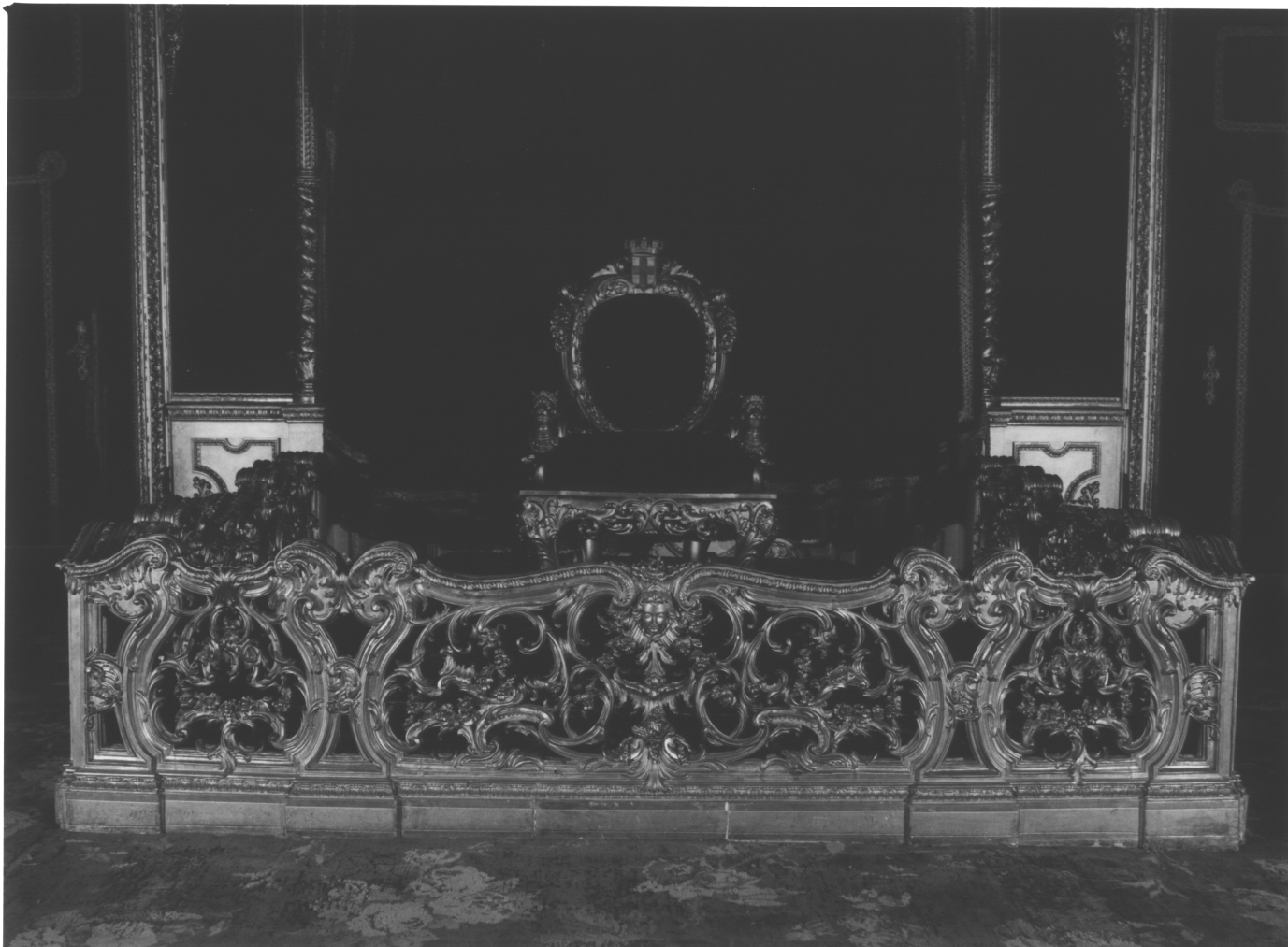 - NOTIZIE STORICO CRITICHE Tra la primavera e l'autunno del 1847 cadono i lavori di riallestimento della sala, già definita "Sala del Trono" nell' inventario del 1844. Il progetto di riallestimento si deve a Michele Canzio, pittore e scenografo tra i più attivi per l’Azienda Generale della Real Casa, come dimostrano sue carte, tra cui una lettera del 28 gennaio 1848, in cui sono menzionati i suoi progetti per la sala, tra cui anche una balaustrata. Per i lavori di intaglio fu contattato l'ebanista piemontese Gabriele Capello detto il Moncalvo, che per il Palazzo aveva lavorato già per il pavimento in legni intarsiati del Bagno del Re. Nel caso della balaustrata, prevista in origine nuova da Canzio, fu invece scelto di recuperare un arredo antico, attribuibile a Benedetto Alfieri (cfr bibliografia: Leoncini 2012, p.300) proveniente dalla Sala del Trono della Regina del Palazzo Reale di Torino. L'oggetto fu probabilmente riadattato in loco, certamente ridorato a Torino prima di arrivare a Genova, come documentato dalla carte conservate ancora oggi nell'Archivio di Stato di Torino (Leoncini, 2012: vedi bibliografia). La scelta di recuperare frammenti originali “in stile” e mescolarli agli apparati realizzati ex novo non è nuova, all'interno del palazzo: nella Sala delle Udienze, ad esempio, si reimpiegarono mantovane esistenti nel guardamobili del palazzo, probabilmente appartenute ai precedenti proprietari