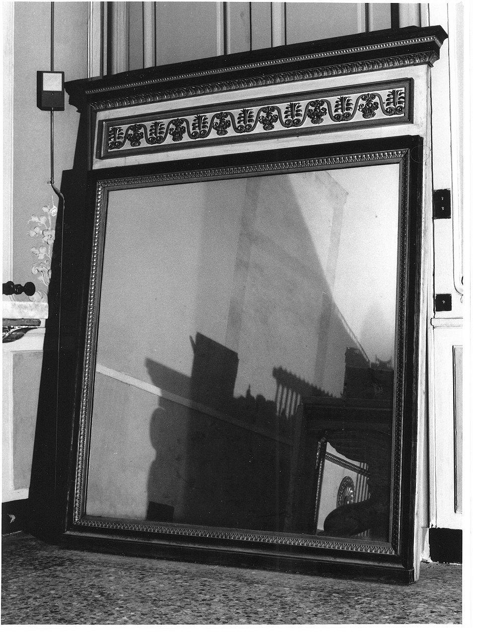 Lo specchio rettangolare ha una cornice dorata con una lista liscia e una a foglie lanceolate. La trabeazione ha un fregio bianco su cui è inserita una tabella con cornice e motivo di volute con rosette alternate a palmette ritte e festoncini di foglie e frutti pendenti (il tutto dorato). L'architrave modanato ha un kyma a foglie di quercia e uno a fogliette lanceolate