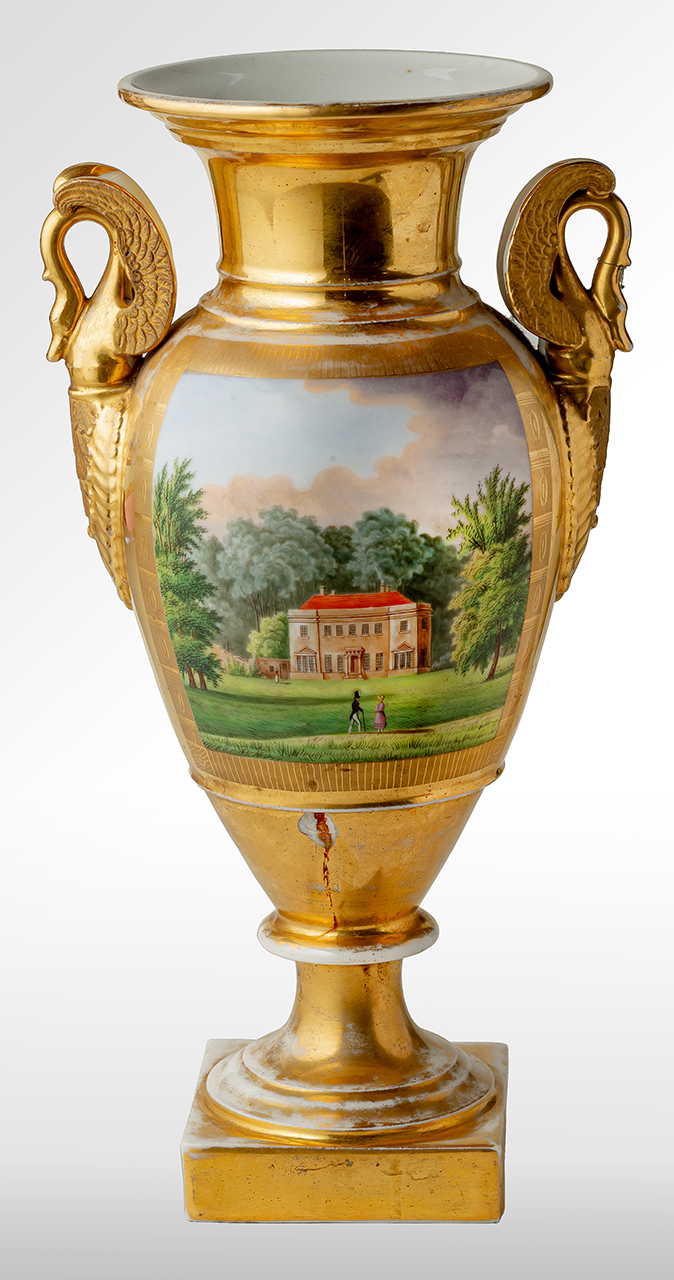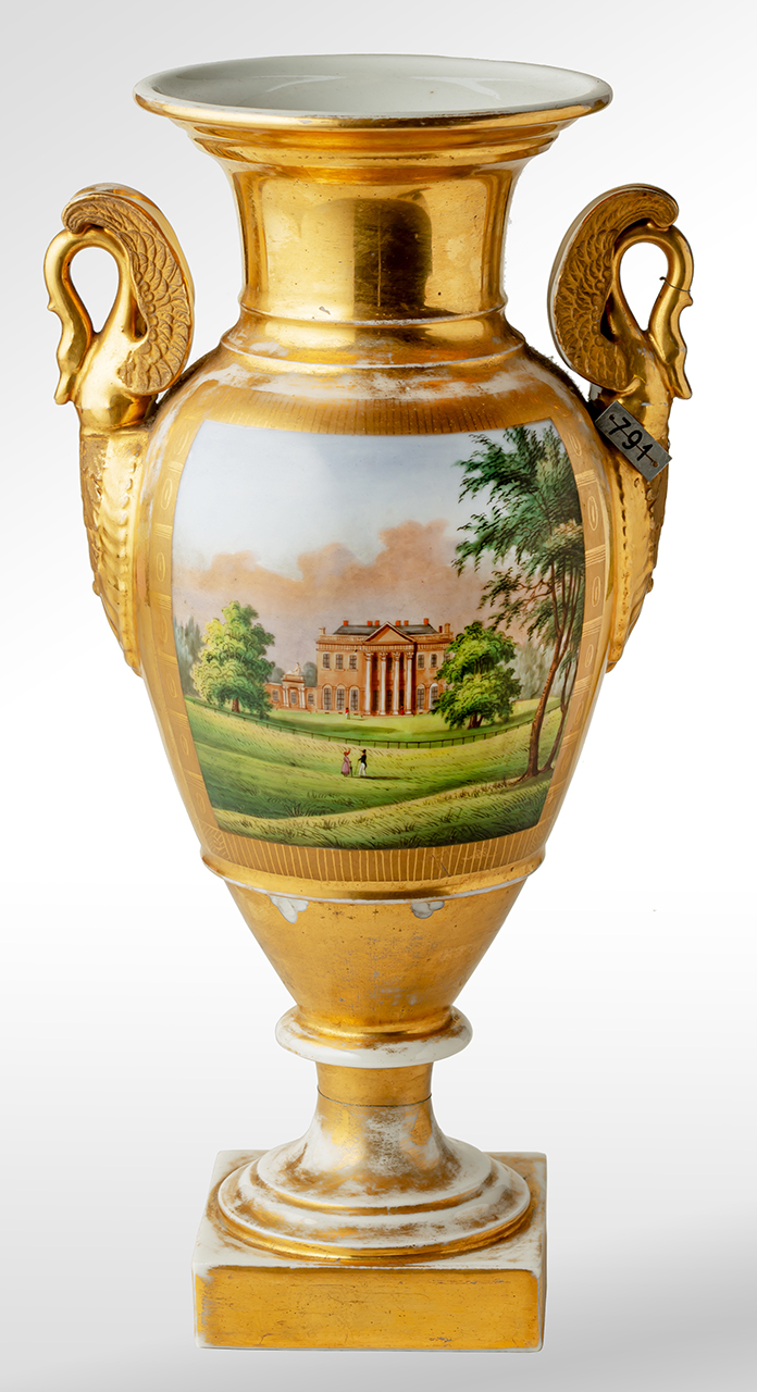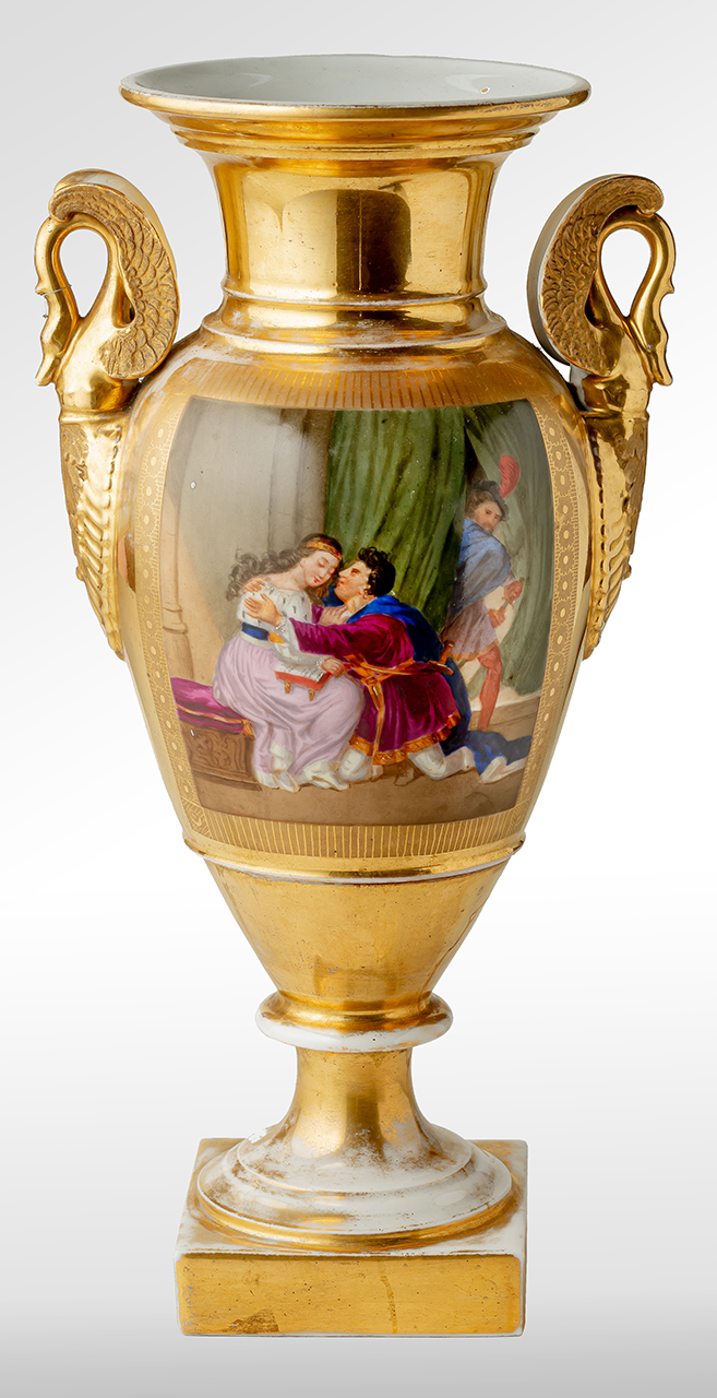 - NOTIZIE STORICO CRITICHE La doratura greve e abbondante, e l'adesione, nei riquadri figurati, ai temi tipici e consueti nella pittura del "Romanticismo storico" e del vedutismo ottocentesco, rivelano la piena appartenenza delle due porcellane alla prima metà dell'Ottocento (cfr. Mottola-Molfino, 1977). Le due scene infatti, vere e proprie miniature, orchestrate su toni freddi e brillanti con fine minuziosa descrittiva, offrono un esempio probante e significativo della riduzione della storia ad aneddoto per una fruizione più immediata e borghese. Caterina Olcese nella sua revisione del 1985 scrive: "un interessante confronto per questi vasi è quello con gli esemplari pubblicati da V. Brosio (1960); si tratta di vasi di probabile produzione italiana, databili al terzo e quarto decennio dell'Ottocento, in cui si evidenzia l'appesantimento di forme Impero derivate dalla Francia"