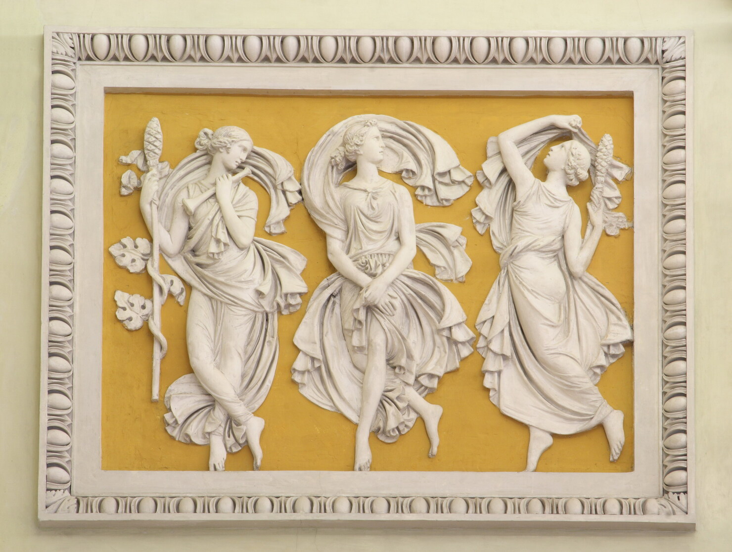 All'interno di riquadri incorniciati, figure femminili danzanti a rilievo su fondo arancione