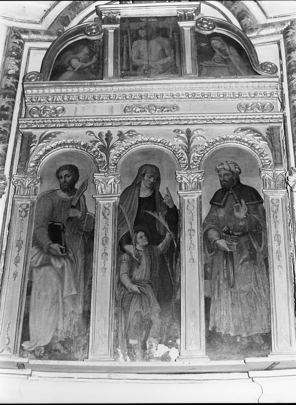 - NOTIZIE STORICO CRITICHE I documenti dell'archivio parrocchiale citano "una vecchia ancona posta nel coro, con in mezzo la Santa Madre e il piccolo San Quirico" nel 1736, in occasione della visita pastorale di Bernardo de Negri; si dice anche che sino al 1735 c'era un altro dipinto con lo stesso soggetto, poi guastato dai muratori nel rifare la facciata; del polittico qui in esame sono da notare forse due differenti mani per la cimasa e i tre scomparti; esso è certamente da inserire fra i trittici e i polittici presenti in varie Chiese del Tigullio (S. Giulia di Centaura, S. Pietro di Rovereto, S. Margherita di Caperana, Parrocchiale di portofino) attribuiti aTeramo Piaggio o al suo ambito; è stato più volte citato nei testi (vedi bibliografia) senza tuttavia una corretta lettura iconografica.Il Calstelnovi, attribuendolo al Piaggio, riconosce i Santi Rocco e Bartolomeo, e fa cenno altresì al trittico di Portofino con i Santi Rocco e Pantaleo; si tratta di una evidente confusione: la nostra opera raffigura un Santo medico, con cassettina e cucchiaio per medicinali, in veste orientale; potrebbe effettivamente essere San Pantaleo (vedi anche iconografia nel Brea, Taggia, Cappella di San Pantaleone di Borghetto/ Kaftal, Iconography of the Saints, Firenze, 1965), mentre non lo è il Santo di Portofino; così pure è errato il nome di San Rocco, in genere in veste di pellegrino di Santiago, con mantella, conchiglie e bordone come infatti è a Portofino.E' invece riconoscibile chiaramente il San Bartolomeo; molti particolari riportano allo stile del Piaggio: l'impianto piuttosto rigido delle figure, i visi fissi, una tonalità bruno-verdagnola diffusa sui panneggi, l'austerità dell'insieme; ben diversa è la cimasa con figure più sfumate e dolci; si può pensare che manchi la predella; si può citare a confronto, anche per la struttura del polittico, il pezzo presente a Rovereto nonchè quello di Portofino (intelaiatura a volute e lesene)