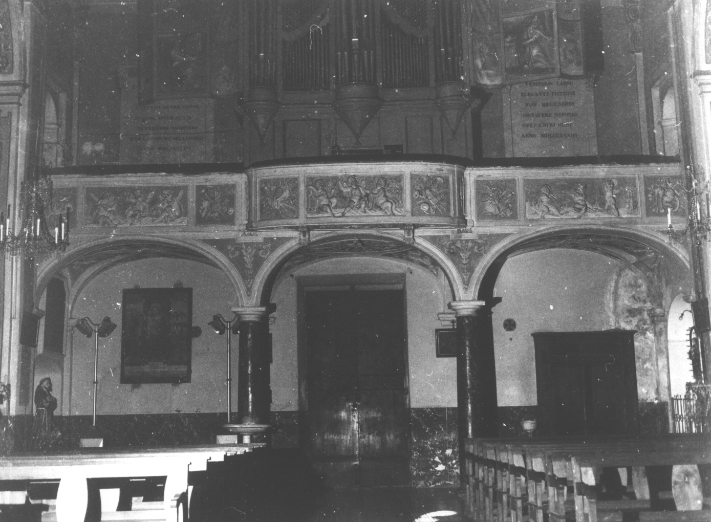 La cantoria è sorretta da tre arcate gravitanti su due colonne in finto marmo. Il parapetto, tripartito con riquadri alterni quadrati e rettangolari, è decorato con motivi a bassorilievo raffiguranti, nelle spaziature quadrate: trionfi musicali; nelle spaziature rettangolari: puttini danzanti; nelle vele in corrispondenza delle colonne: motivi floreali