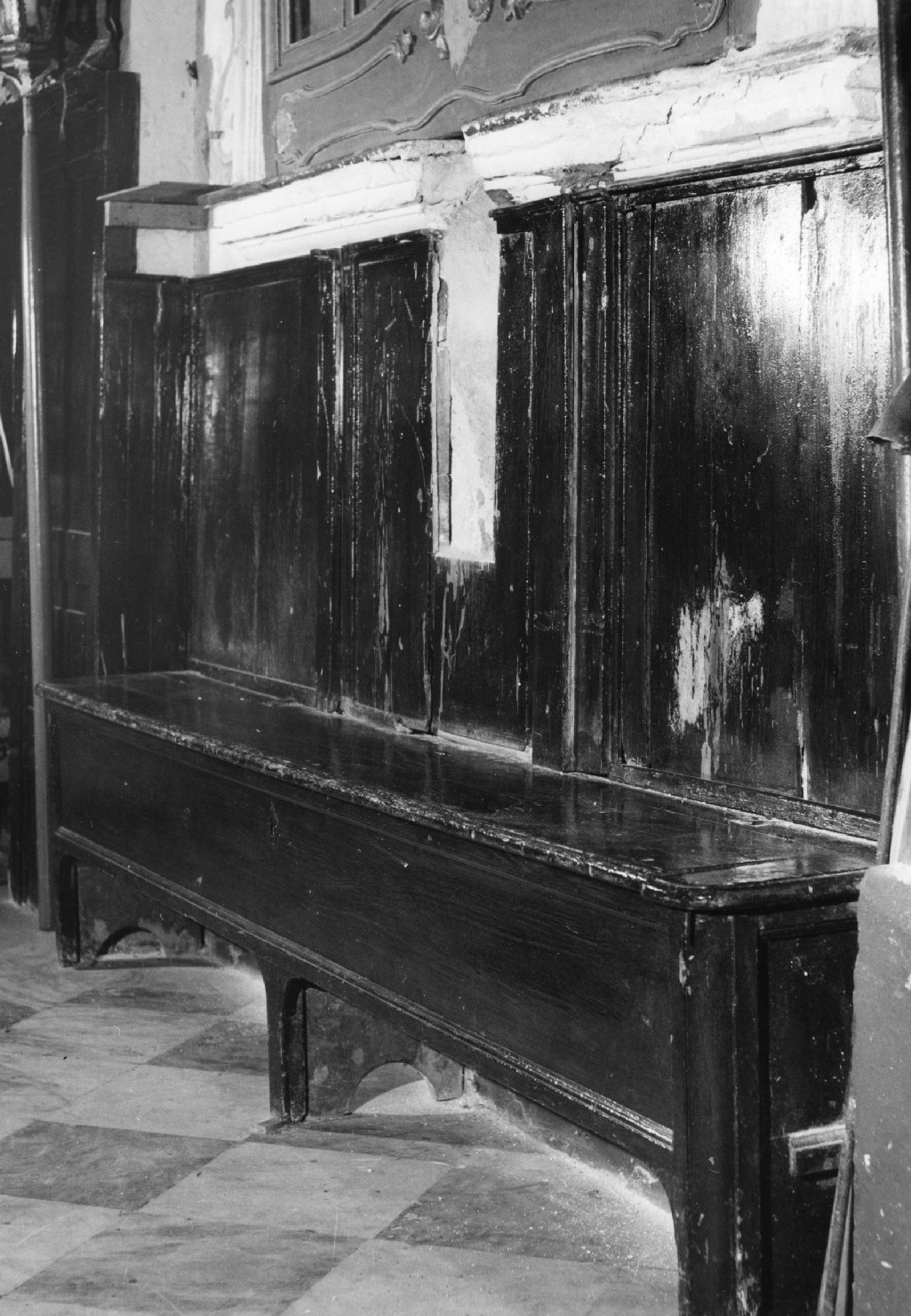 Cassapanche con piano sollevabile, poggianti su 3 doppiezampe; presentano la spalliera aderente alla parete e decorata da lesene. parte delle serrature originarie