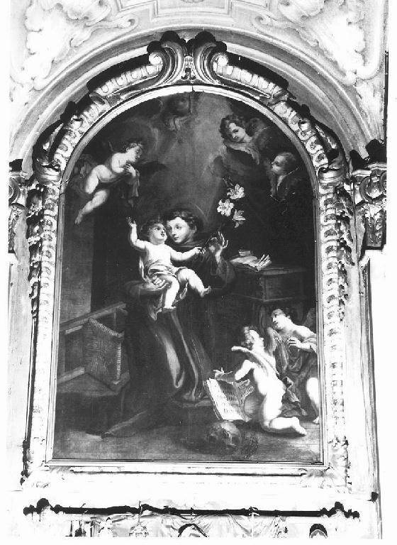 Personaggi: Sant'Antonio da Padova; Gesù Bambino. Figure: Angeli; cherubini. Attributi: (Sant'Antonio da Padova) giglio. Oggetti: libro; teschio; inginocchiatoio; sedia