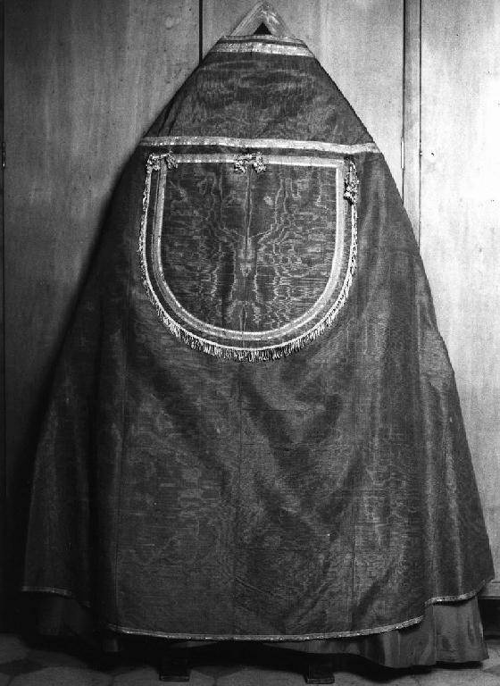 piviale di colore rosso con fodera di colore rosso e con galloni di colore giallo dorato decorato con motivi geometrici. Lo scudo è provvisto di frange e alamari dorati.parato in taffetas marezzato; gallone tessuto in filo dorato e di seta; frangia in cordoncino dorato; fodera in taffetas; alamari in filo dorato e di seta; fibula in tessuto