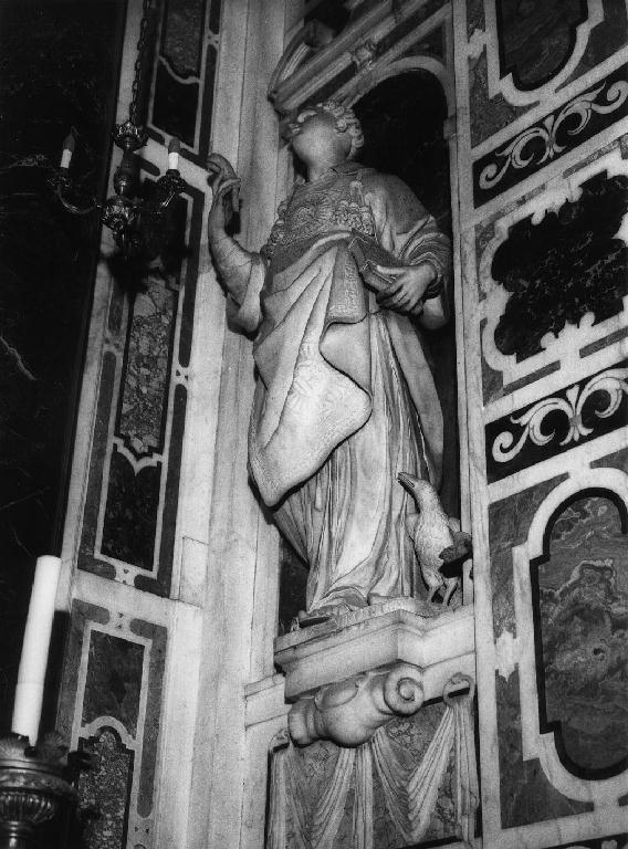 Statua a tutto tondo su mensola aggettante inserita entro nicchia circolare. Il santo, raffigurato in sembianze giovanili, è raffigurato stante. Veste la dalmatica e il capo tonsurato è rivolto verso l'alto. Con la mano sinistra regge la palma, con la destra un volume. A lato compare un volatile