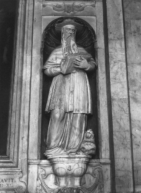 Statua virile su alto piedistallo e inserita entro una nicchia a valva di conchiglia; la figura barbuta e panneggiata è intenta ad annotare su un libro aperto che regge nella mano sinistra; indossa abito cardinalizio. Ai suoi piedi giace un leone