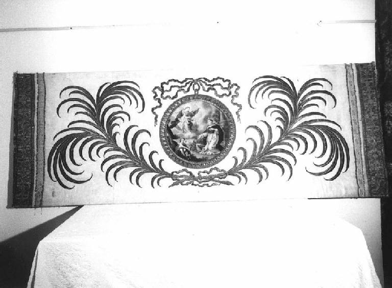 PALIOTTO IN TESSUTO CON RICAMI IN ORO E SCENA DIPINTA INSERITO SU SUPPORTO LIGNEO. ENTRO UN MEDAGIONE DI TIPO METALLICO, CON NASTRO, E' RAFFIGURATA L'APPARIZIONE DELLA MADONNA COL BAMBINO A S. DOMENICO,IN PRESENZA DI UN CHERUBINO.PALIOTTO IN RASO CON RICAMI IN FILO DI SETA E D'ARGENTO DORATO A PUNTO POSATO; SCENA DIPINTA AD OLIO SU SUPPORTO LIGNEO; GALLONE A TELAIO IN FILO DI SETA E FILO D'ARGENTO DORATO