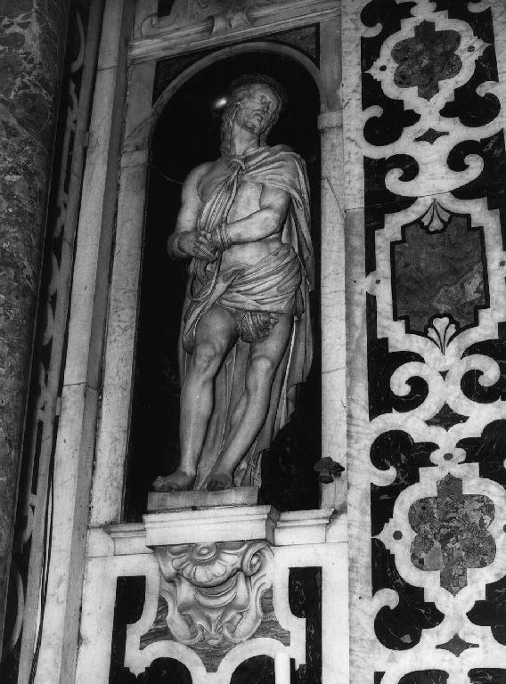 Statua a tutto tondo inserita entro nicchia semicircolare e poggiante su mensola. Cristo è raffigurato stante, un perizoma gli cinge i fianchi, un clamide annodato sul petto gli scopre le spalle. Le mani sono incrociate sul ventre; i polsi sono stretti da una corda, il capo è rivolto verso destra. Il viso, incorniciato da barba e baffi, è accigliato in un'espressione di dolore