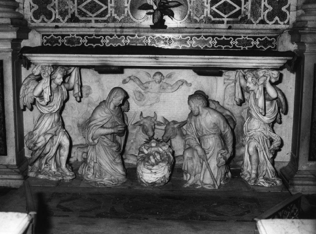 Gruppo di cinque figure a tutto tondo; due figure a sostegno della mensa. Sul retro, lastra scolpita a rilievo stiacciato. Al centro la mangiatoia sulla quale è disteso il Bambino Gesù appena nato. La Vergine in preghiera e, dalla parte opposta, San Giuseppe che si prostra. In secondo piano, dietro alla Vergine, un pastore anch'egli in adorazione. Un altro pastore sopraggiunge recando un agnello. Nella lastra che chiude la scena figurano il bue e l'asino. Un altro pastore e un angelo in volo con cartiglio chiudono la scena