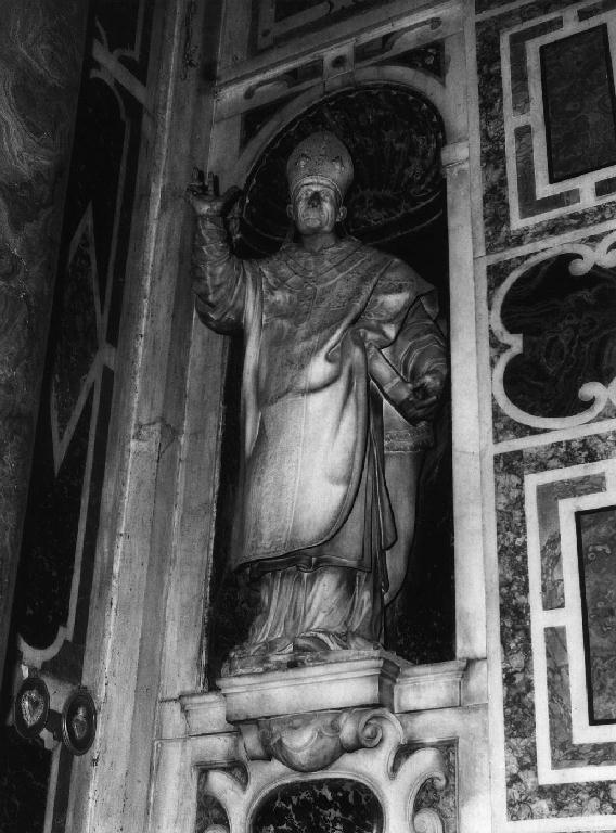 Statua a tutto tondo su mensola aggettante inserita entro nicchia circolare con catino a conchiglia. Il santo è raffigurato in posizione stante, con il braccio sinistro sollevato nel gesto benedicente. Quello destro è invece abbandonato su di un fianco a reggere un libro. I lineamenti del volto, con il naso adunco, gli zigomi sporgenti, rispondono all'iconografia tradizionale. Veste i paramenti sacri con camice, cotta, piviale e le insegne vescovili