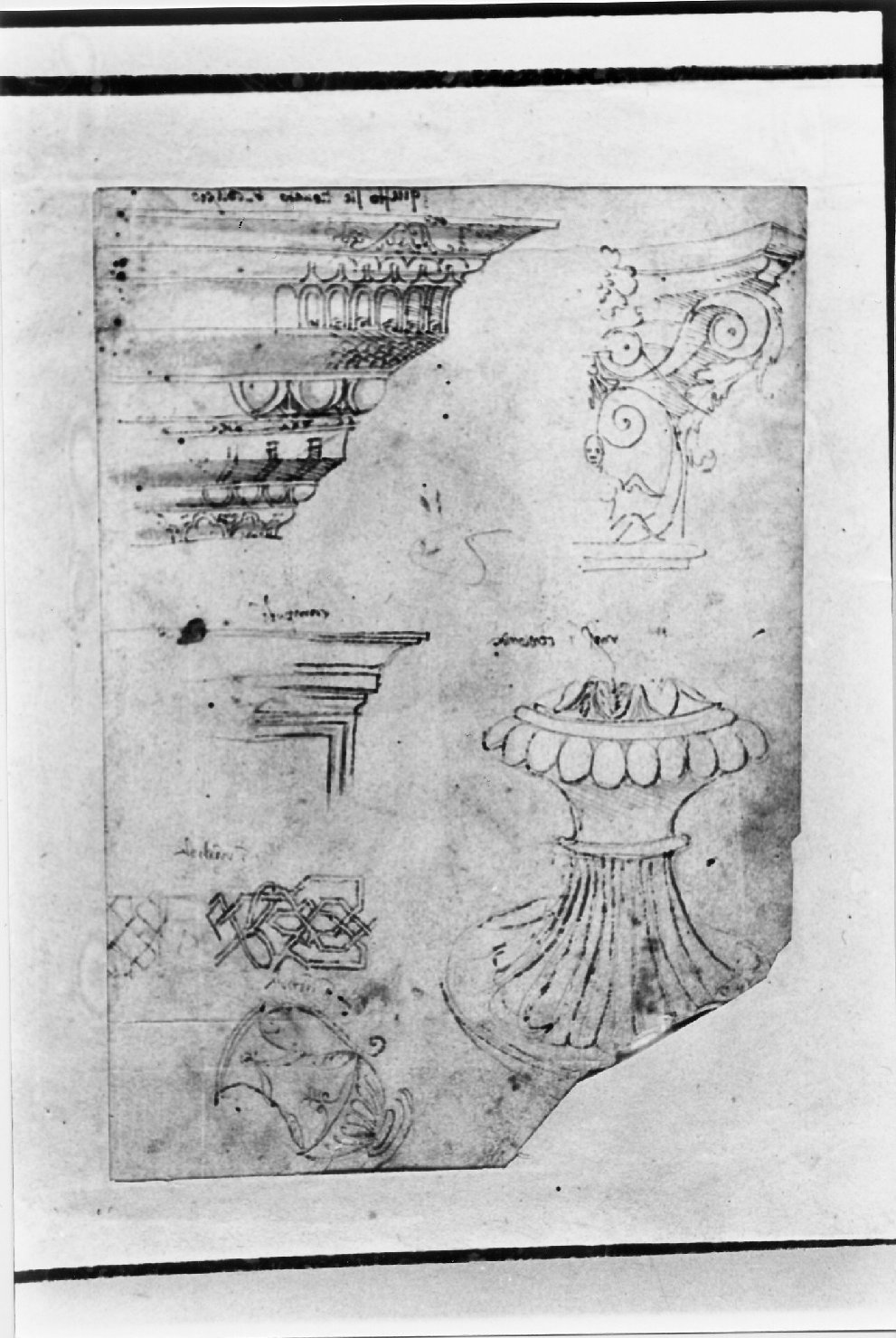- NOTIZIE STORICO CRITICHE Disegno su carta, penna, pennello, inchiostro bruno raffigurante frammenti architettonici, elementi decorativi, un vaso e una base di cratere in pietra. Si tratta del verso del primo foglio del taccuino
