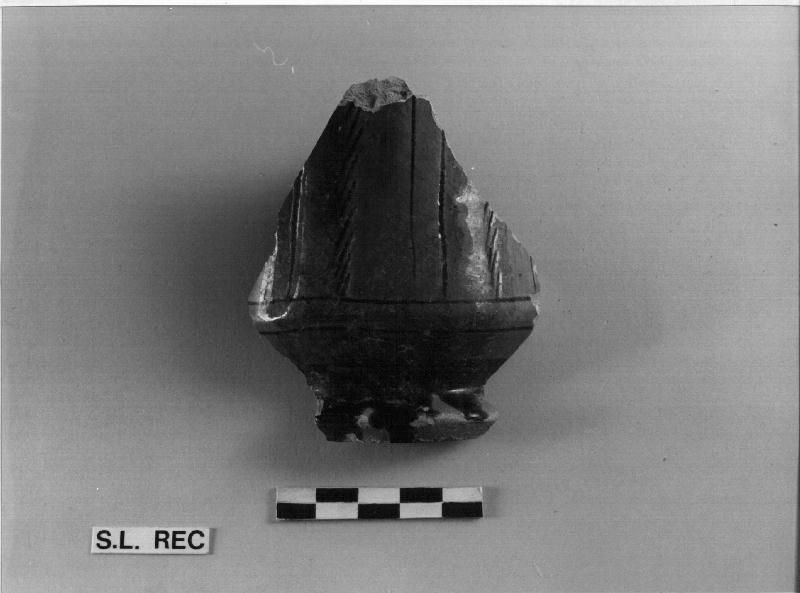 FRAMMENTO DI PARETE CON PIEDE SAGOMATO/ VETRINA DI COLOREGIALLO MARRONE/ DECORAZIONE A LINEE GRAFFITA